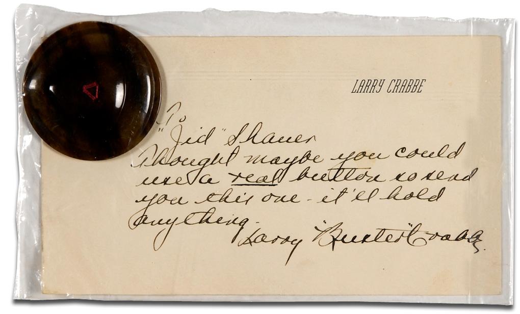 Vintage fountain pen signature and inscription, “To ‘Jid’ Shauer, Thought maybe you could use a real button so send you this one—it’ll hold anything. Larry ‘Buster’ Crabbe,” on one of Crabbe’s off-white 6.5 x 3.75 personal note cards with one of his personally owned oversized clothing buttons affixed at top left. In fine condition, with a light shade of even toning.