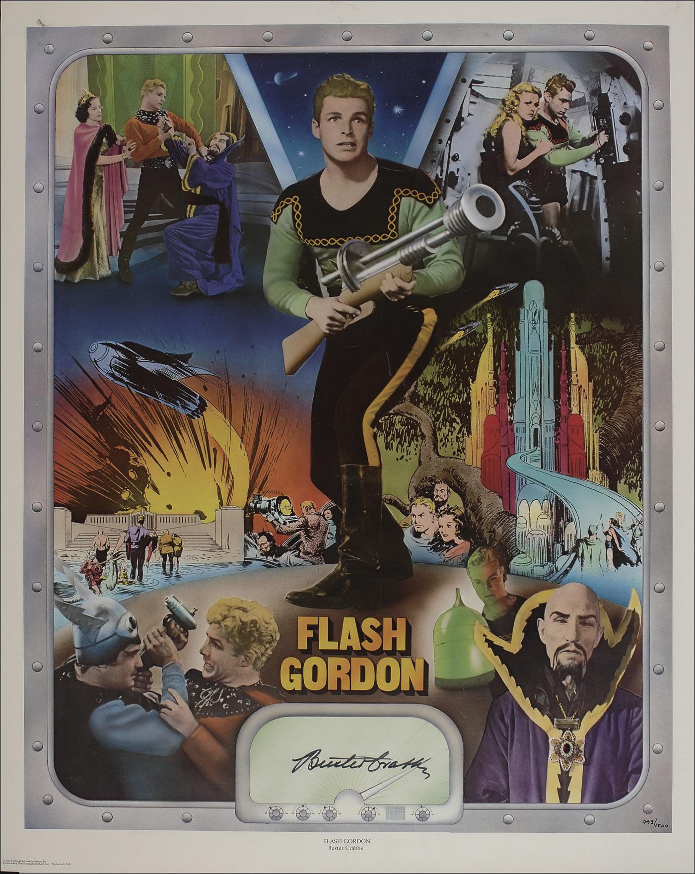 Beautiful limited edition full-color 24 x 30 print featuring a great collage of Flash Gordon scenes, #993/1500, signed in the lower border in black felt tip. Rolled and in fine condition, with some scattered light creasing and edge dings. Pre-certified PSA/DNA and RRAuction COA.