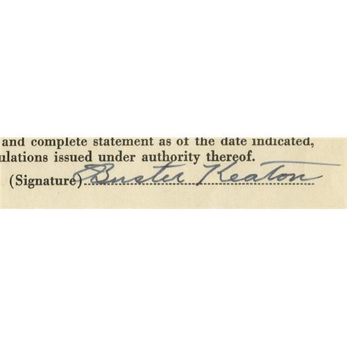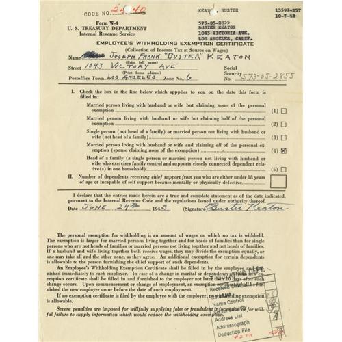 <B>Buster Keaton Signed W-4 Form.</B></I> A W-4 form dated June 24, 1943, filled out and signed by Keaton in black ink. The signature comes from an interesting and rather sad era for the fallen Silent comedy star, then scrambling to find supporting roles in wartime comedies. In Fine condition with mild tanning and file holes punched along the top edge.<I>Accompanied by LOA from PSA/DNA.</B></I><BR><BR><b>Shipping:</b> Small Flat (<a target="_blank" href="http://www.heritageauctions.com/common/shipping.php">view shipping information</a>) <BR><BR><B>Important notice:<