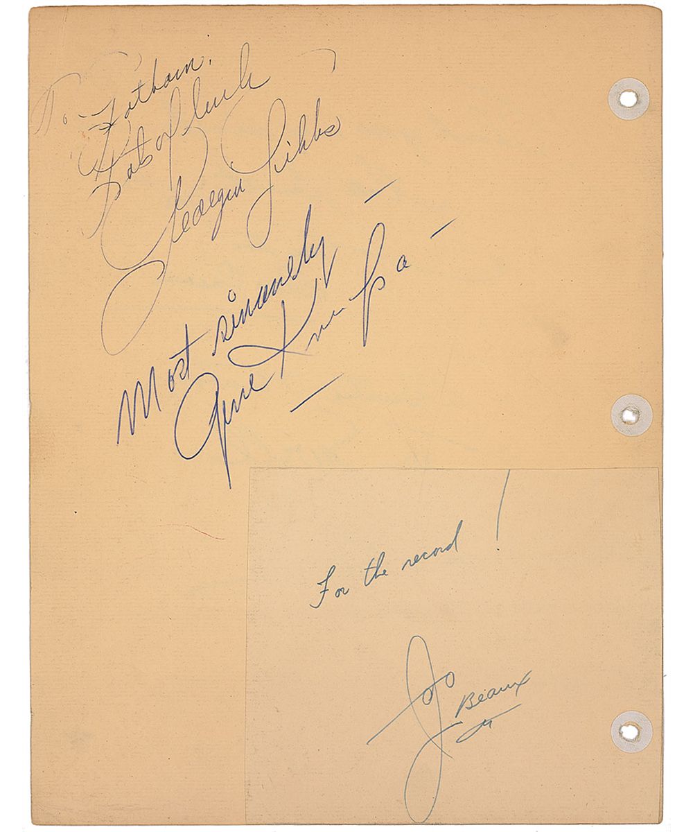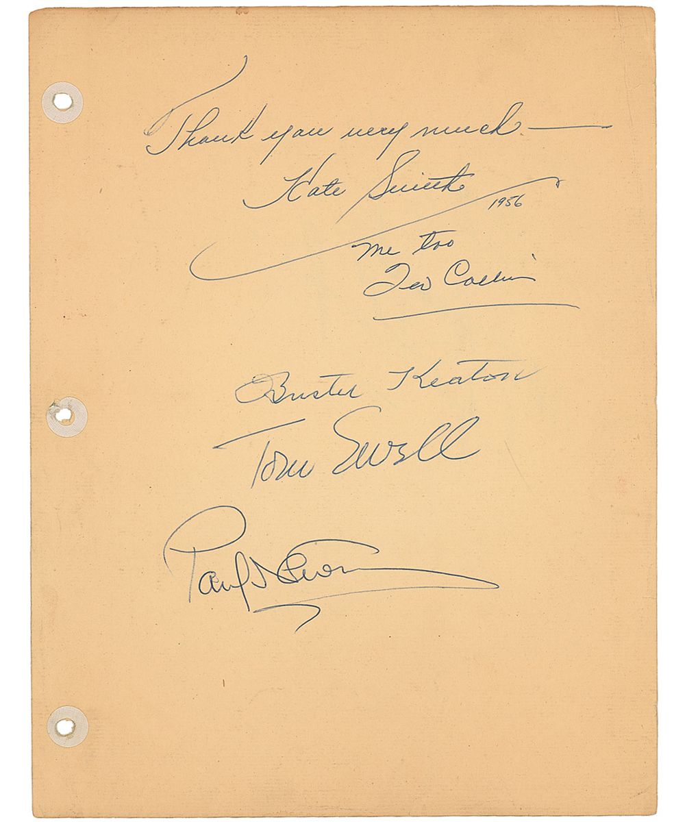 Ballpoint signatures of Buster Keaton, Paul Newman, Kate Smith, and Tom Ewell on an off-white 8.5 x 11 sheet, also signed on the reverse by Gene Krupa. In fine condition, with scattered creases and uniform toning.