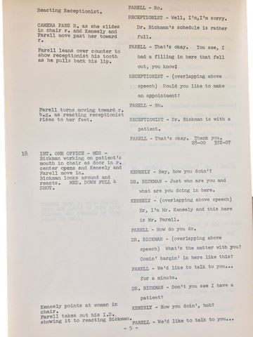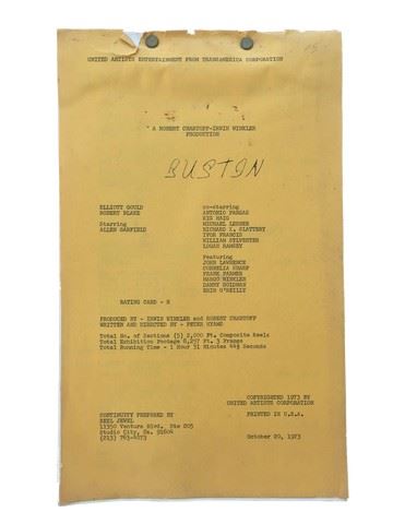"Busting" (1974) from United Artists, original script and combined continuity. This was the main inspiration behind the very successful series "Starsky and Hutch". Starring Elliot Gould as Vice Detective Kennedy, Robert Blake as Vice Detective Farrell, Michael Lerner as Michael, Allen Garfield as Carl Rizzo, and Antonio Fargas as Stephen. Los Angeles Vice cops tidy up the streets from the drug dealers, prostitutes and petty thugs without fuss or much real interest. Goaded by the brashness of a mobster, the electric partners go after him, earning not only his wrath but that of their department superiors, who would rather that Kennedy and Farrell stick to going after petty criminals. (Approx. 14"x9").