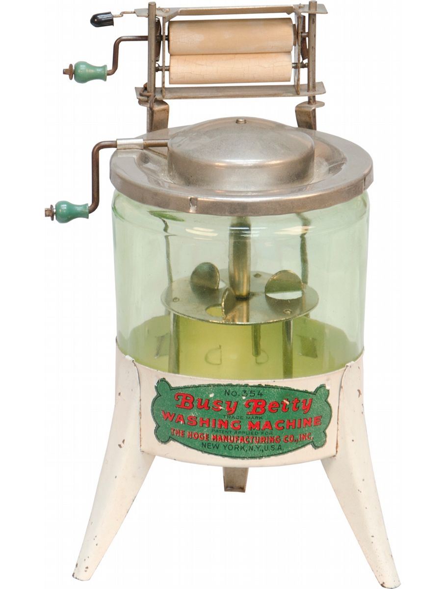 Busy Betty TM Washing Machine Salesman Sample No.354 by the Hoge Manufacturing Co., Inc. New York, N.Y., U.S.A. - Painted metal and glass parts, works w/ hand cranks - 10"h