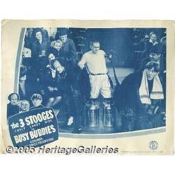 <B>Busy Buddies (Columbia, 1944)</B></I> Lobby Card (11" X 14"). Moe and Larry are caught with their cow suits down in this scene from "Busy Buddies". Curly had been trying to win a cow-milking contest, but needed the other boys' help. Now they're all rather stuck. A rare Three Stooges card, even more desirable with Curly pictured. Pinholes, edge wear, corner creases, and water damage on one side of the card. Very Good+.