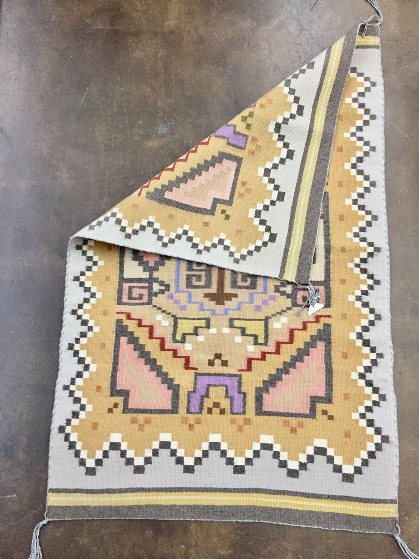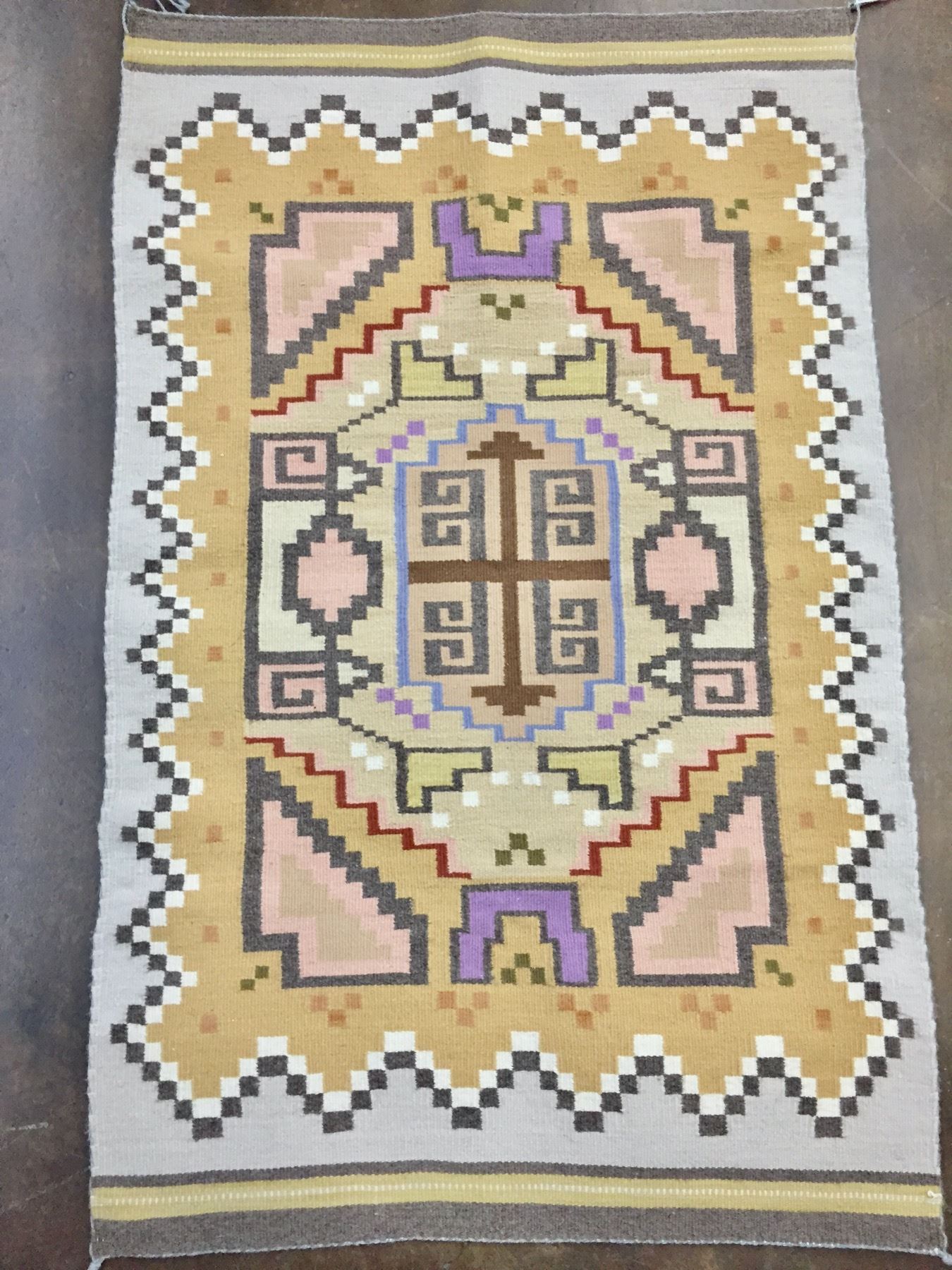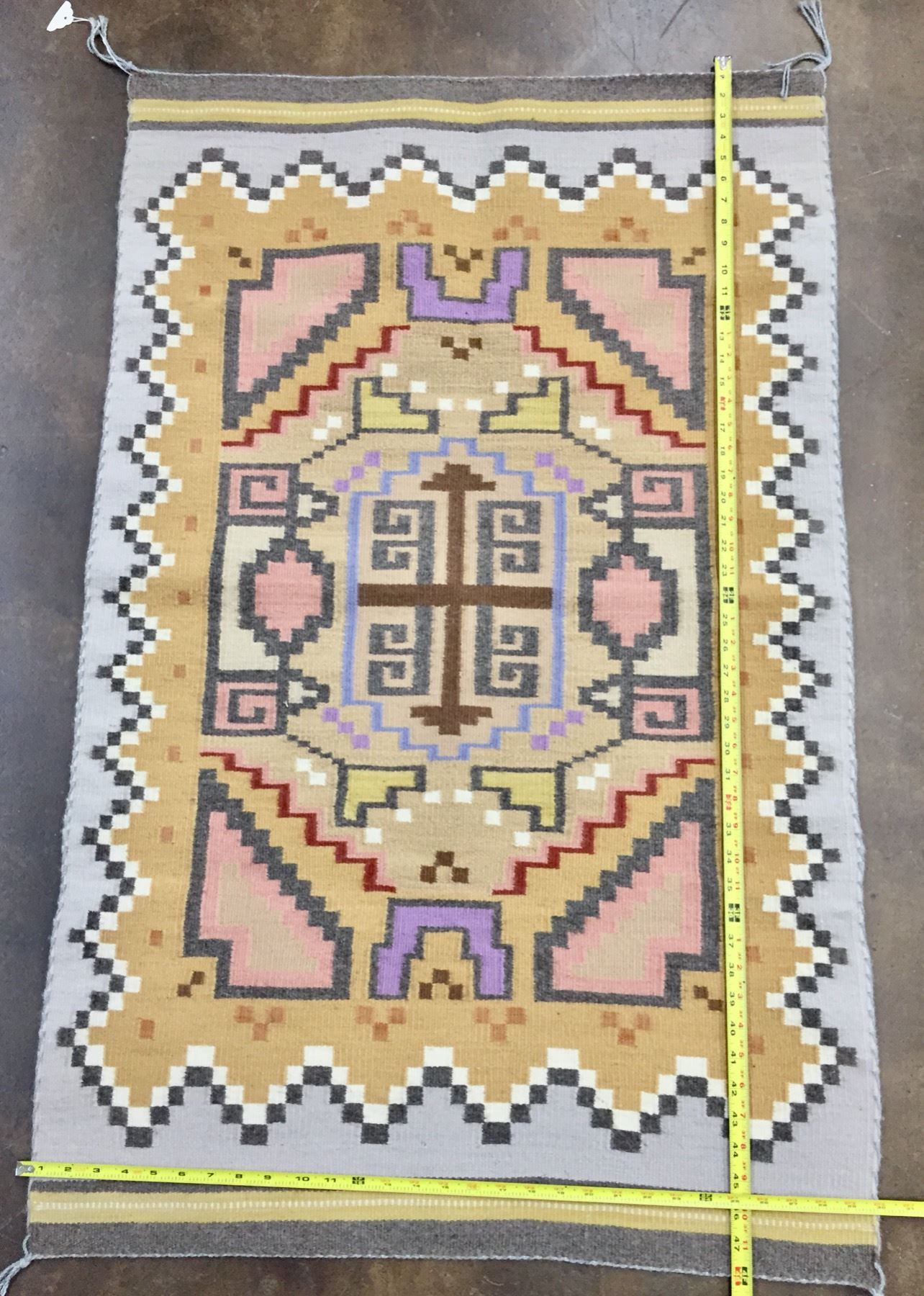Description: Presented for sale in this lot we have a finely woven Burntwater regional Navajo textile featuring beautiful geometric patterns in cream, yellow, pinks, gray, red and green threads. Maker: Unknown Navajo weaver. Approx. Age: Vintage. Size: 31 inches wide x 48 inches long. Condition: Good for its age, normal wear expected. Please look closely at the pictures - they are an important part of our description. Shipping: There will be a $10 handling, packaging fee for shipping this lot. The actual cost of postage will be added on top of that.