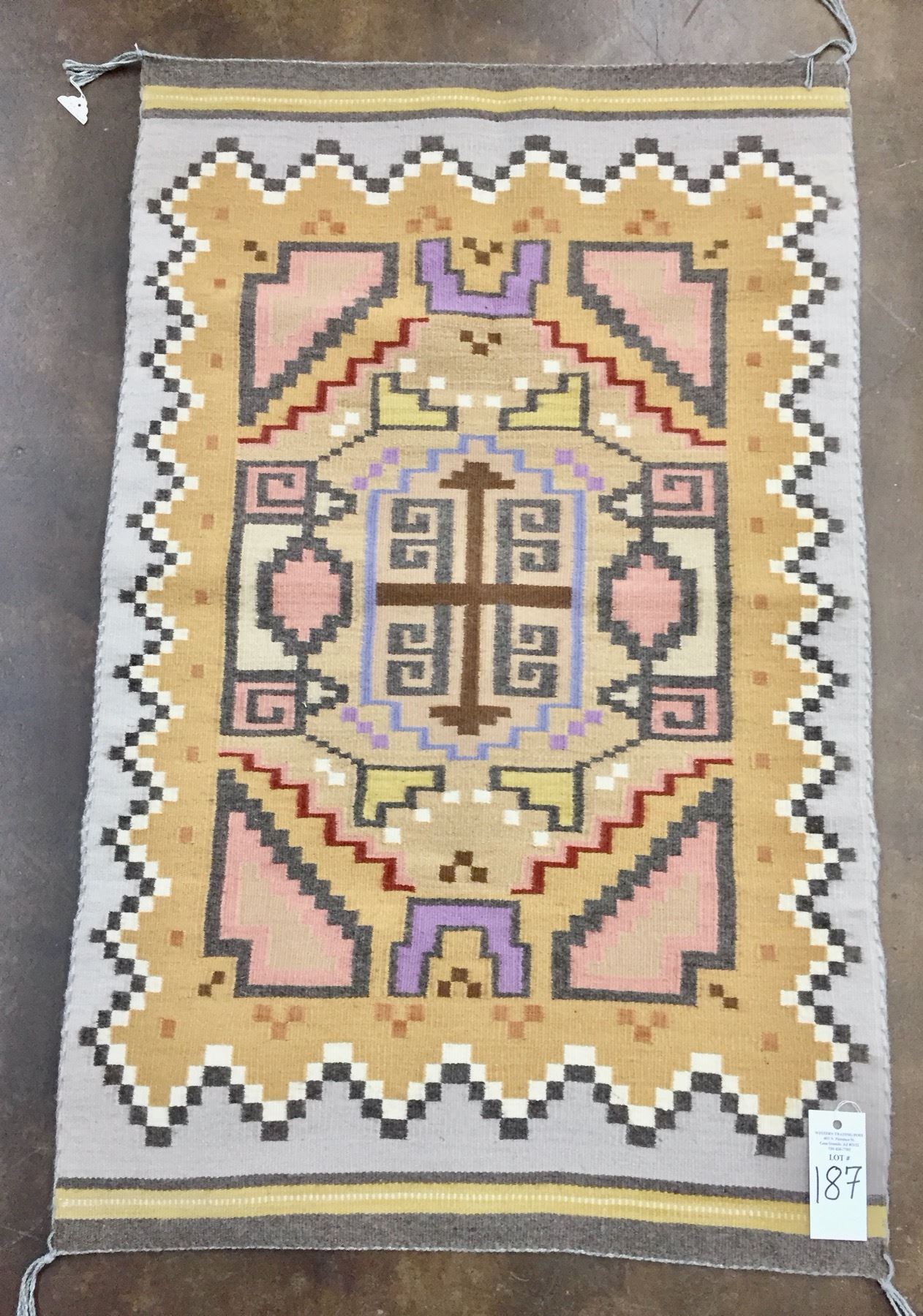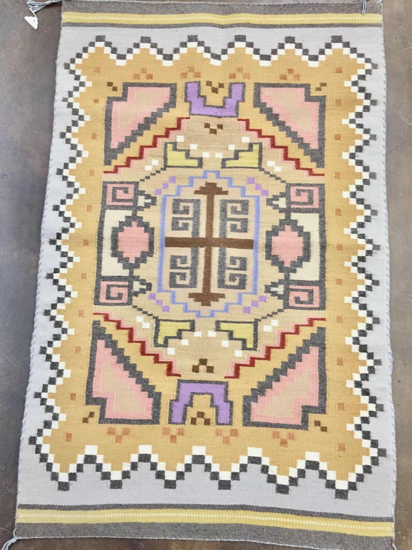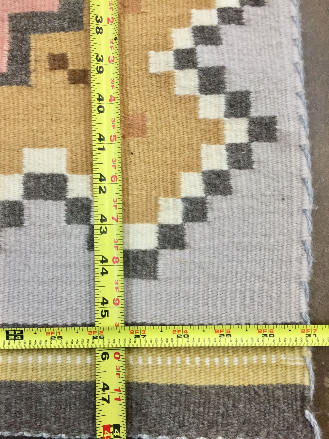 Description: Presented for sale in this lot we have a finely woven Burntwater regional Navajo textile featuring beautiful geometric patterns in cream, yellow, pinks, gray, red and green threads. Maker: Unknown Navajo weaver. Approx. Age: Vintage. Size: 31 inches wide x 48 inches long. Condition: Good for its age, normal wear expected. Please look closely at the pictures - they are an important part of our description. Shipping: There will be a $10 handling, packaging fee for shipping this lot. The actual cost of postage will be added on top of that.