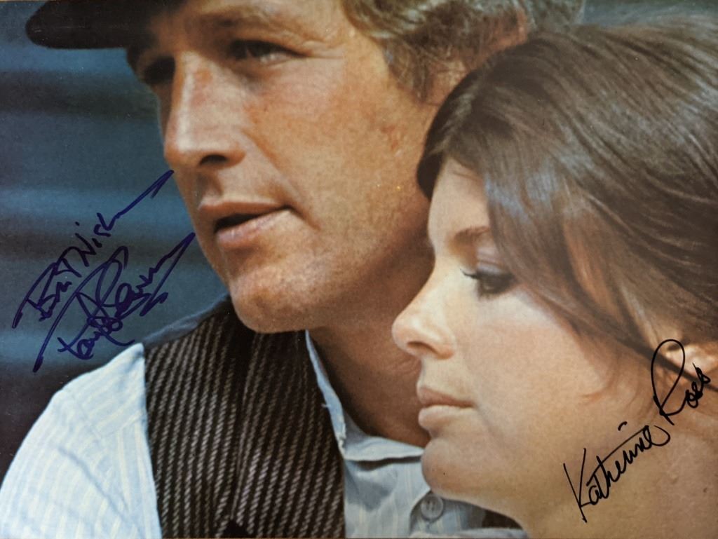 Butch Cassidy and the Sundance Kid signed movie photo autographed by Paul Newman and Katherine Ross, measures 10 x14 inches. Butch Cassidy and the Sundance Kid is a 1969 American Western film directed by George Roy Hill and written by William Goldman. Based loosely on fact, the film tells the story of Wild West outlaws Robert LeRoy Parker, known as Butch Cassidy (Paul Newman), and his partner Harry Longabaugh, the Sundance Kid (Robert Redford), who are on the run from a crack US posse after a string of train robberies. The pair and Sundance's lover, Etta Place (Katharine Ross), flee to Bolivia in search of a more successful criminal career.
