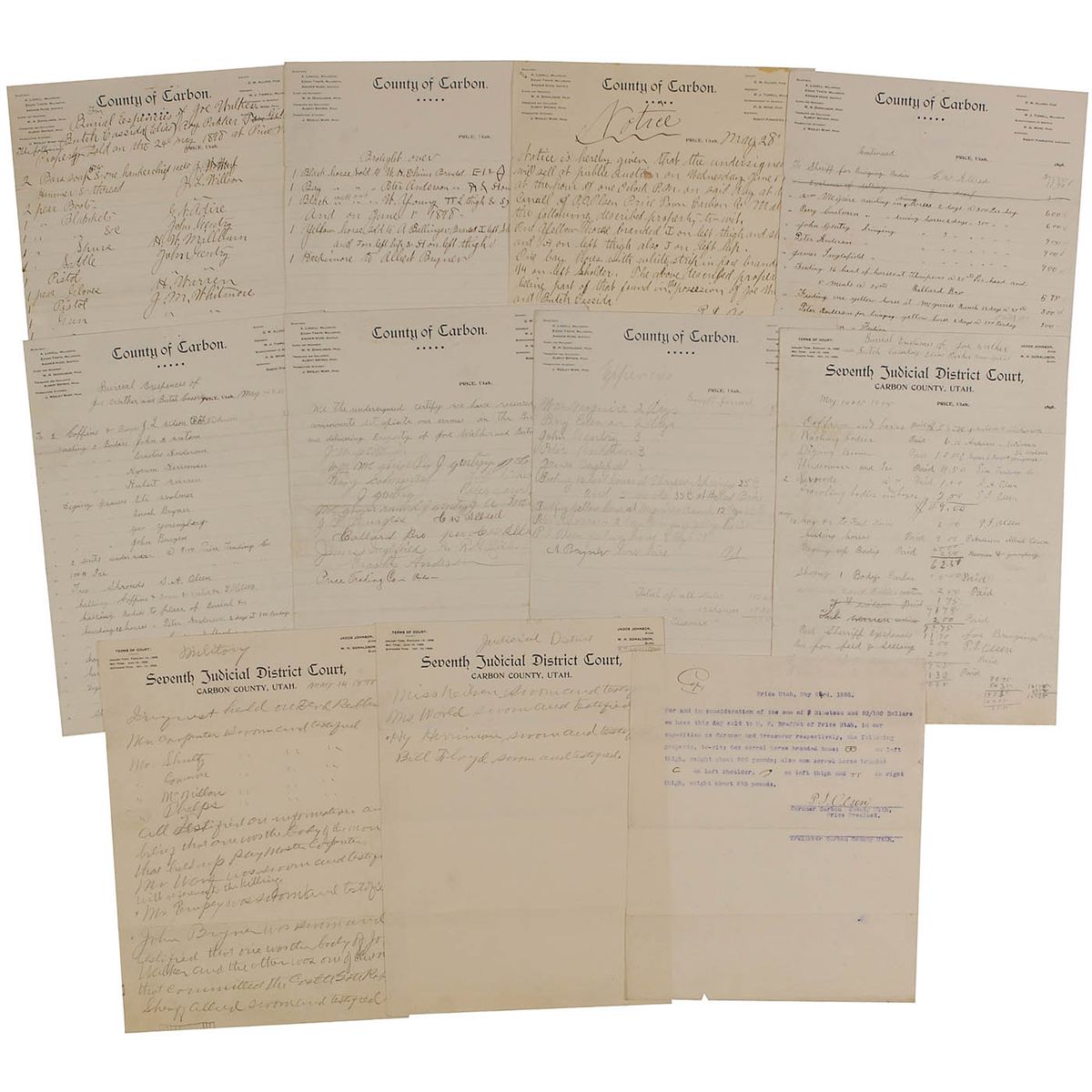 Manuscript document, two pages, 8.25 x 11, County of Carbon letterhead. “For Burial Espencies of Joe Walker Butch Cassida (Elias) Roy Parker Tom Gilis. The following Property Sold on the 24th May 1898 at Price Utah.” Over 20 items, with price and name of buyer, including pistols, a gun, boots, blankets, seven horses, saddle, and spurs. Second page is headed “Brought over,” and lists “1 Black horse sold,” also “1 Bay” horse and “1 Yellow horse sold,” with drawings of the brands on the horses. Purchasers’ names and prices are listed.