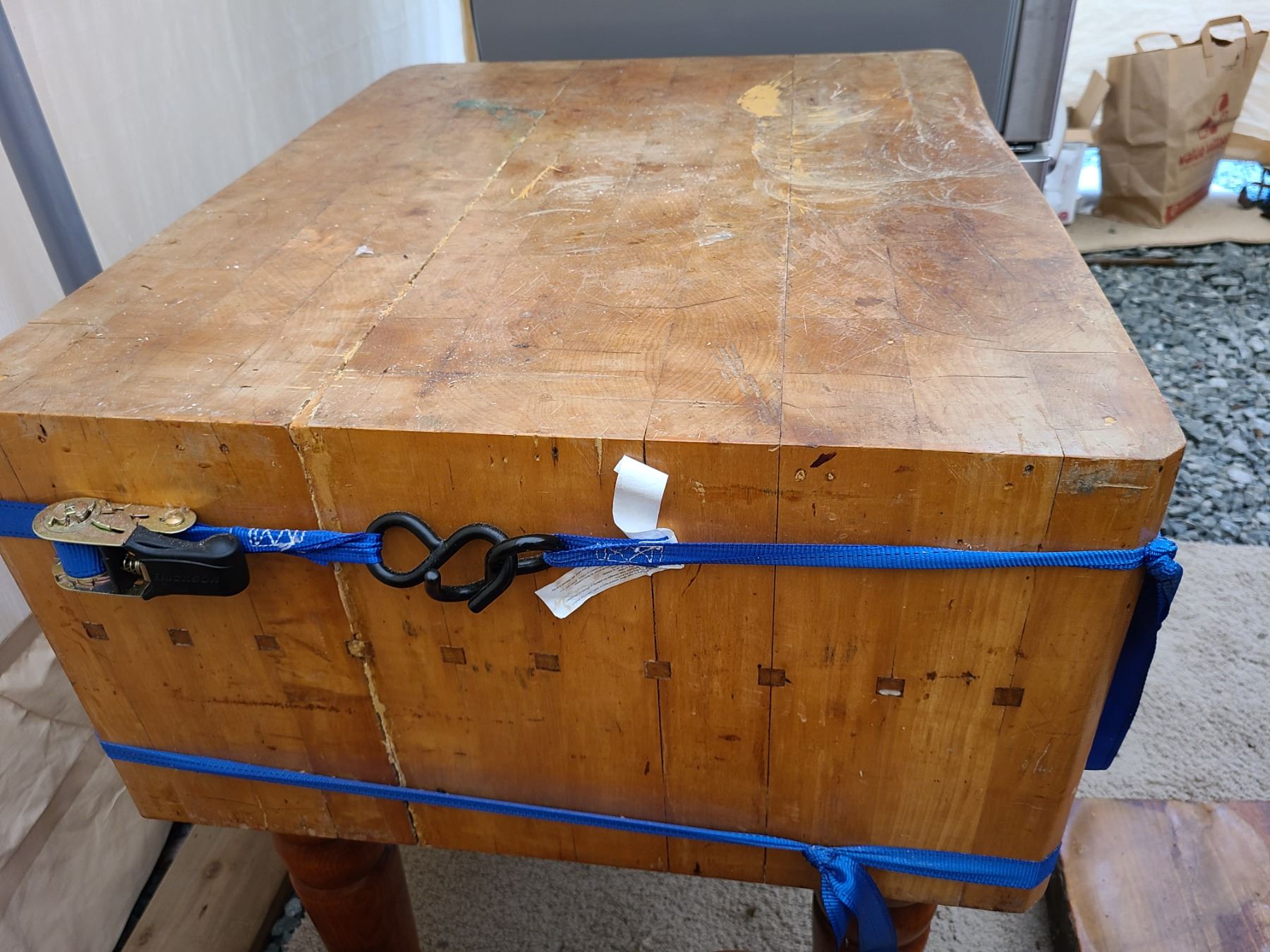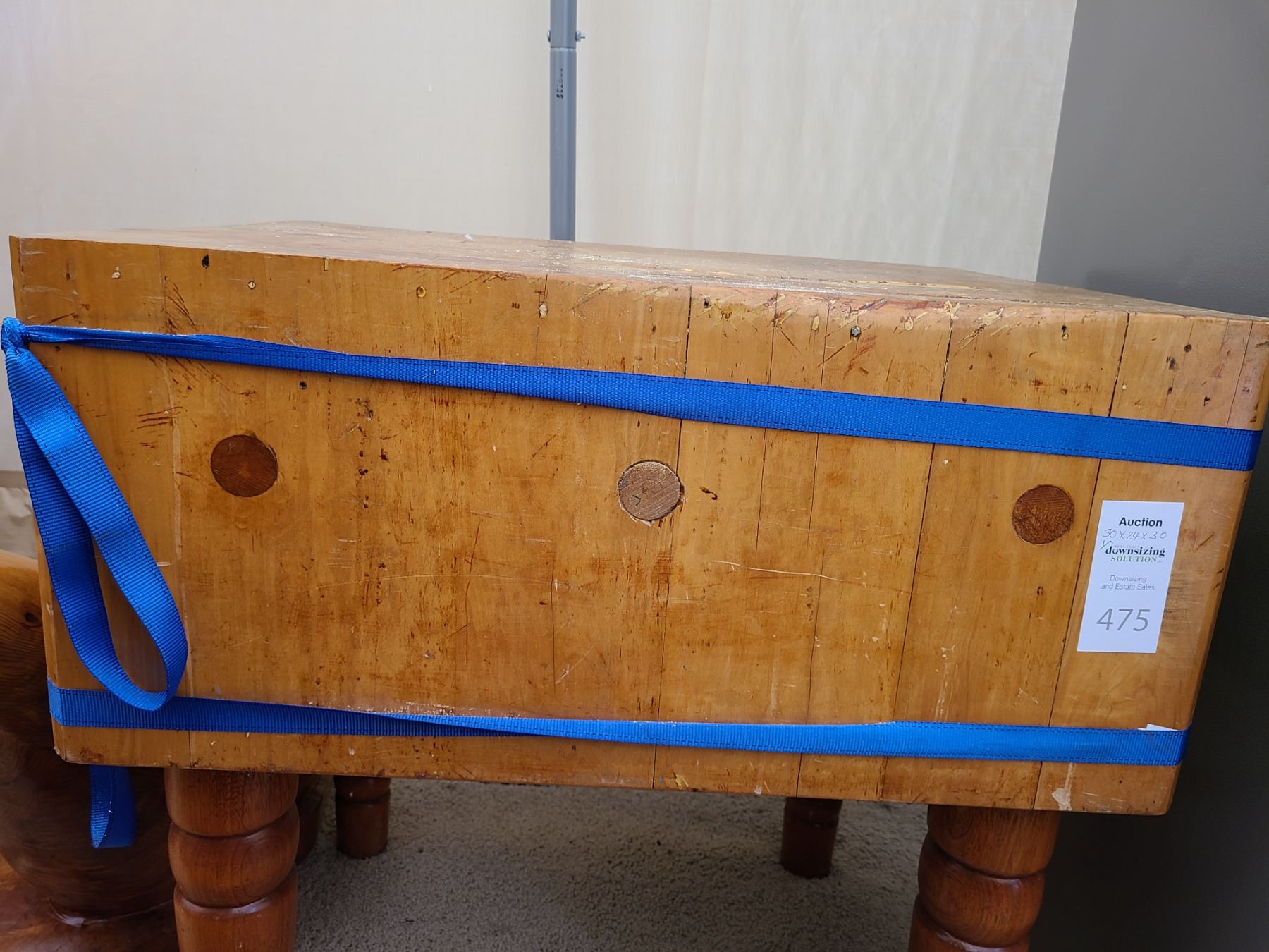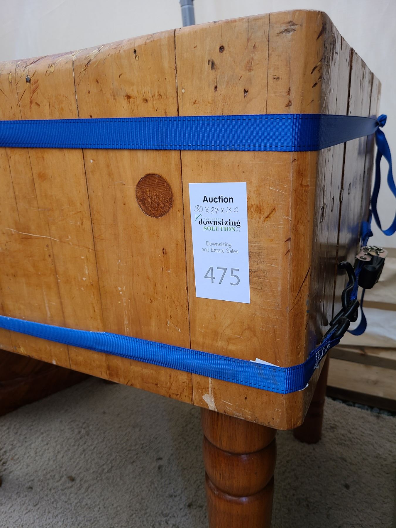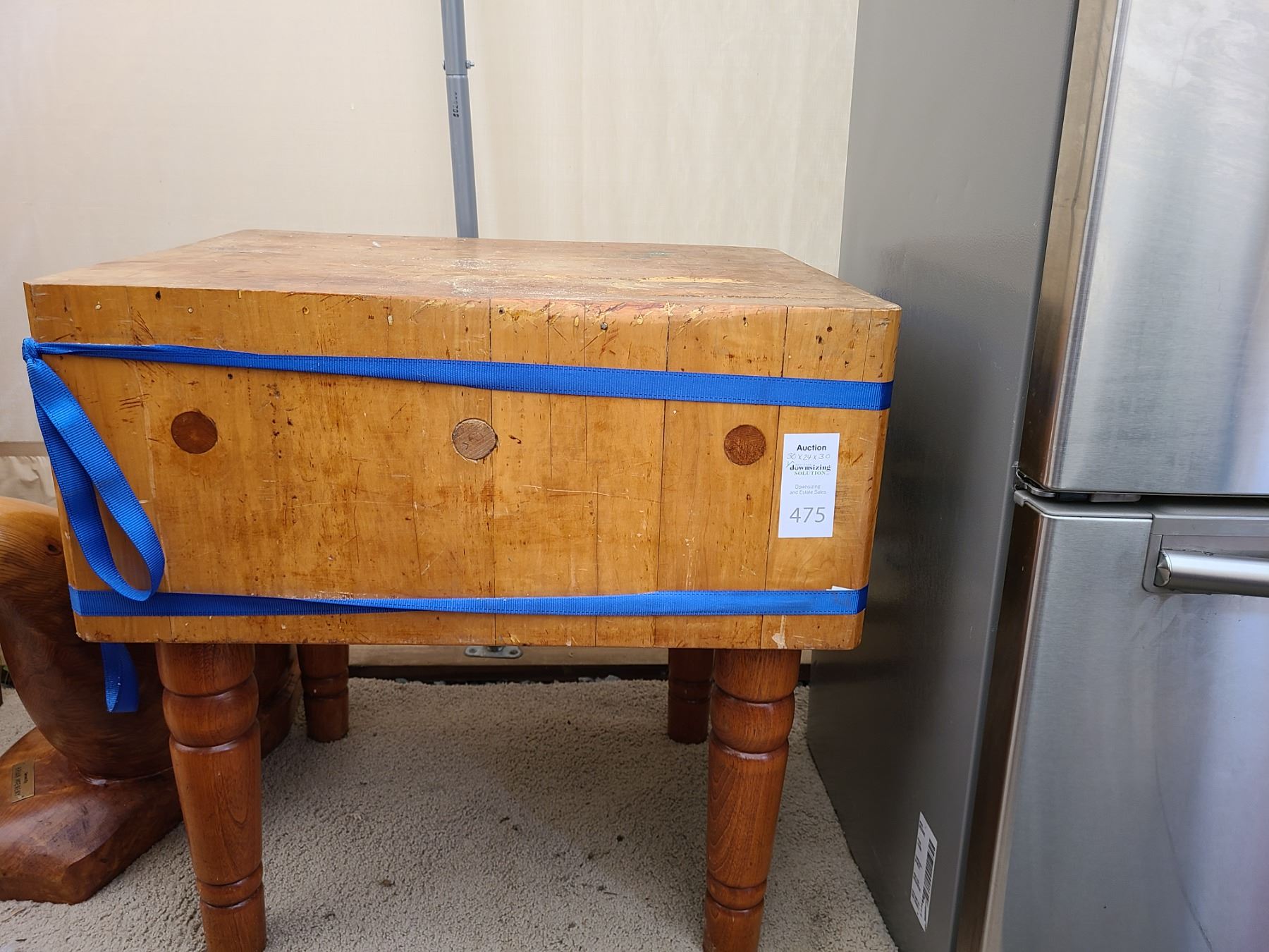 Butcher’s block 30x24x30 has been glued and is still strapped. Very heavy bring help to move. Pickup at 11am