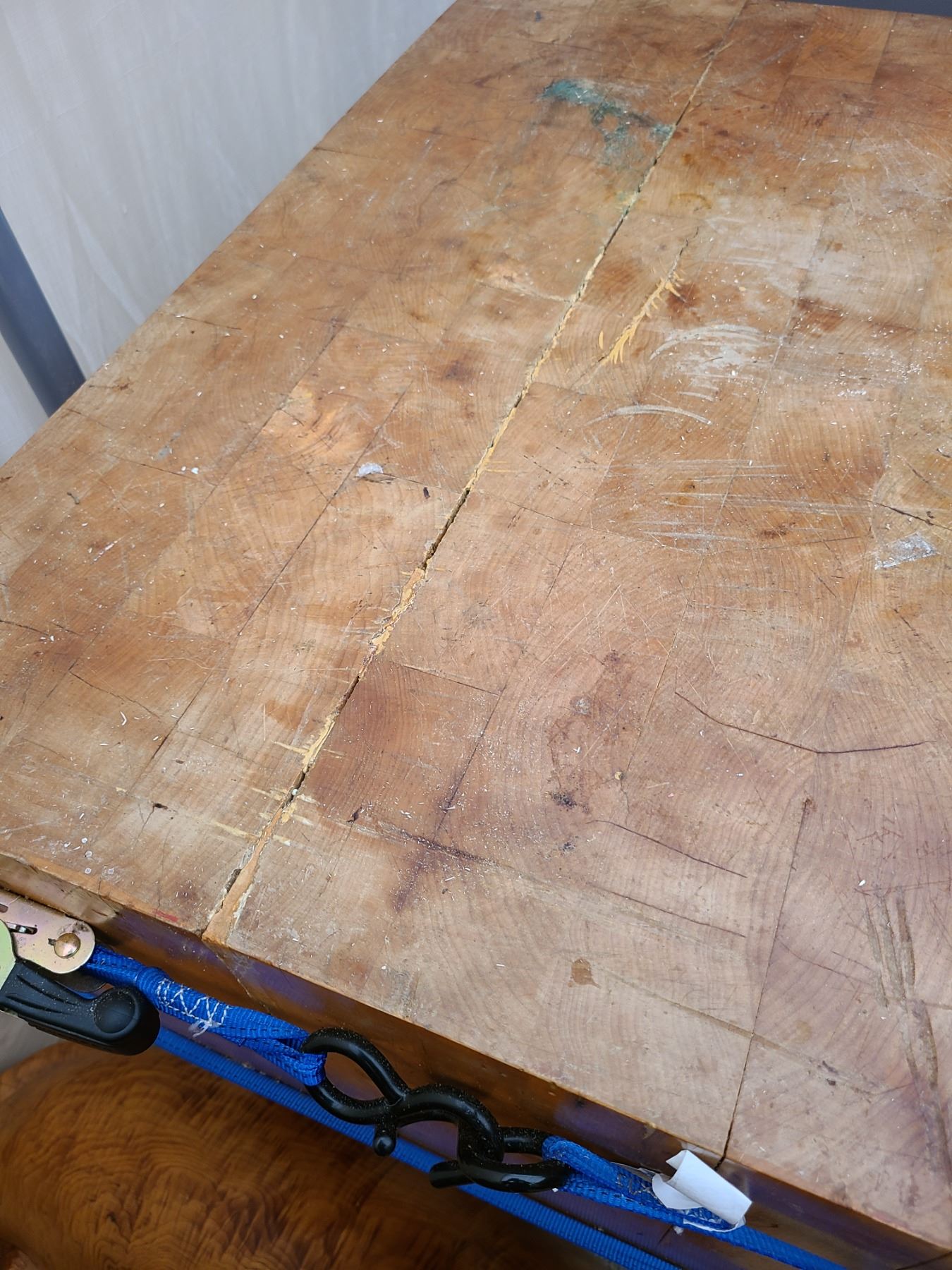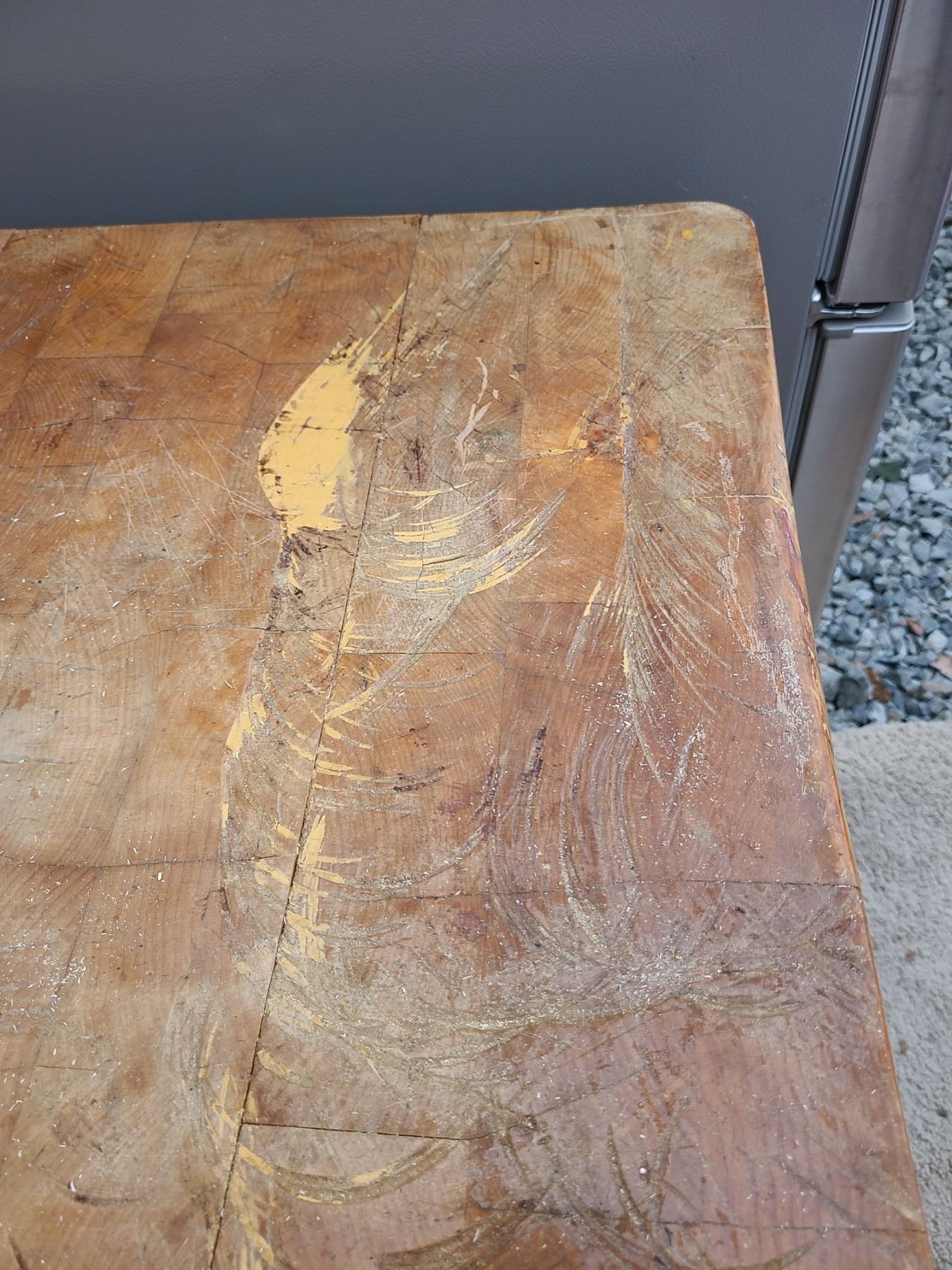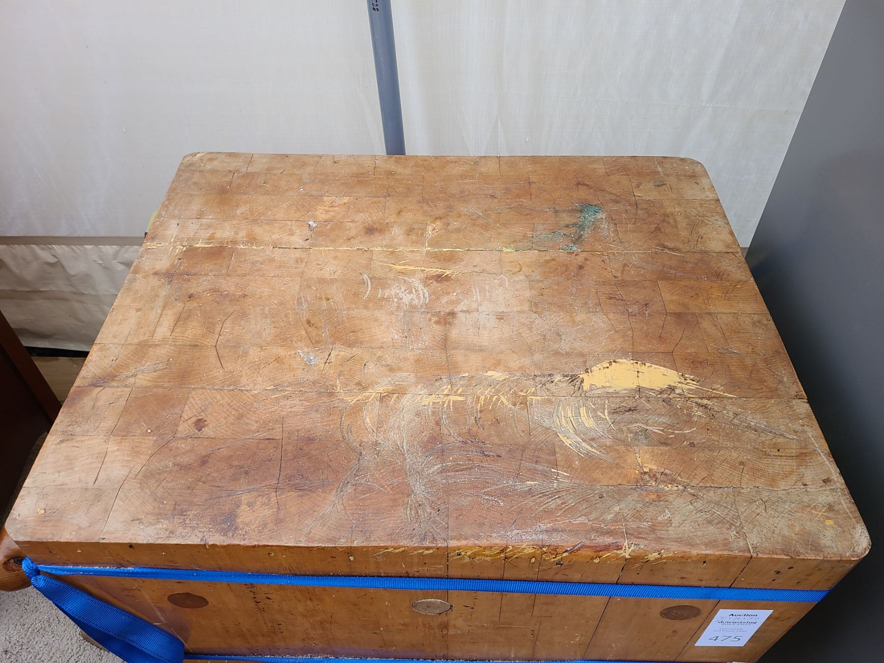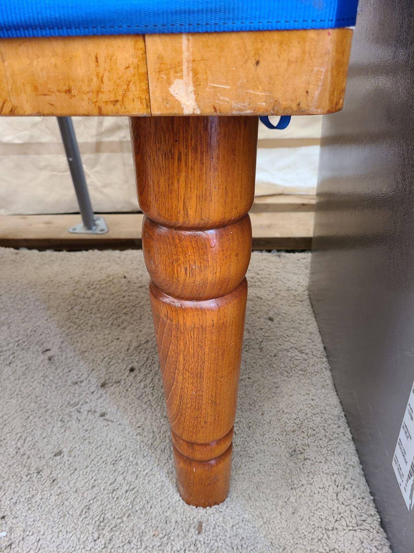 Butcher’s block 30x24x30 has been glued and is still strapped. Very heavy bring help to move. Pickup at 11am