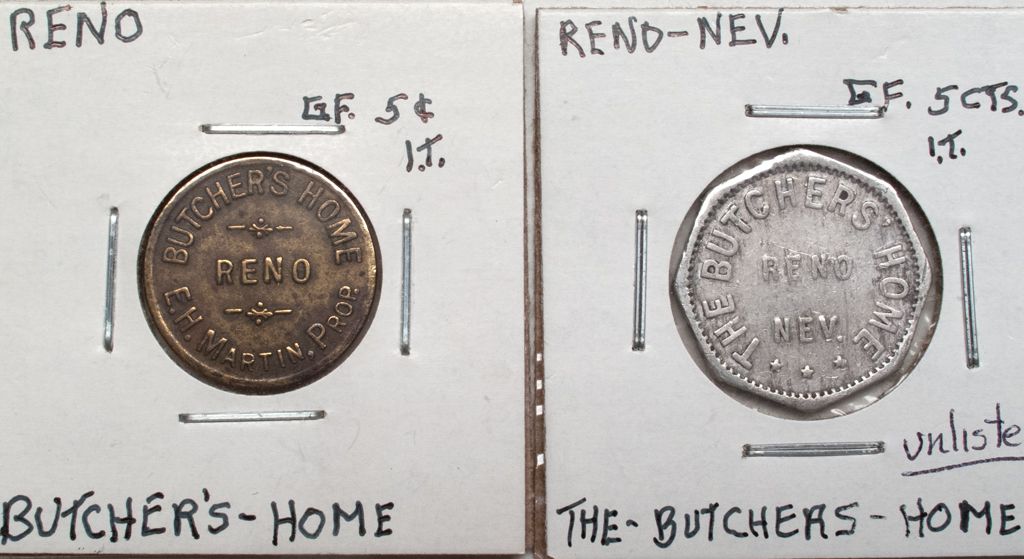 Lot of two. 1) Butcher's Home / Reno / EH Martin, Prop. // GF 5c IT. Brass. Round. 2) The Butcher's Home / Reno / Nev // GF 5c IT. Octagonal. Aluminum. The second token is unlisted in the Nevada token book!City: RenoCounty: WashoeState: NVDate: