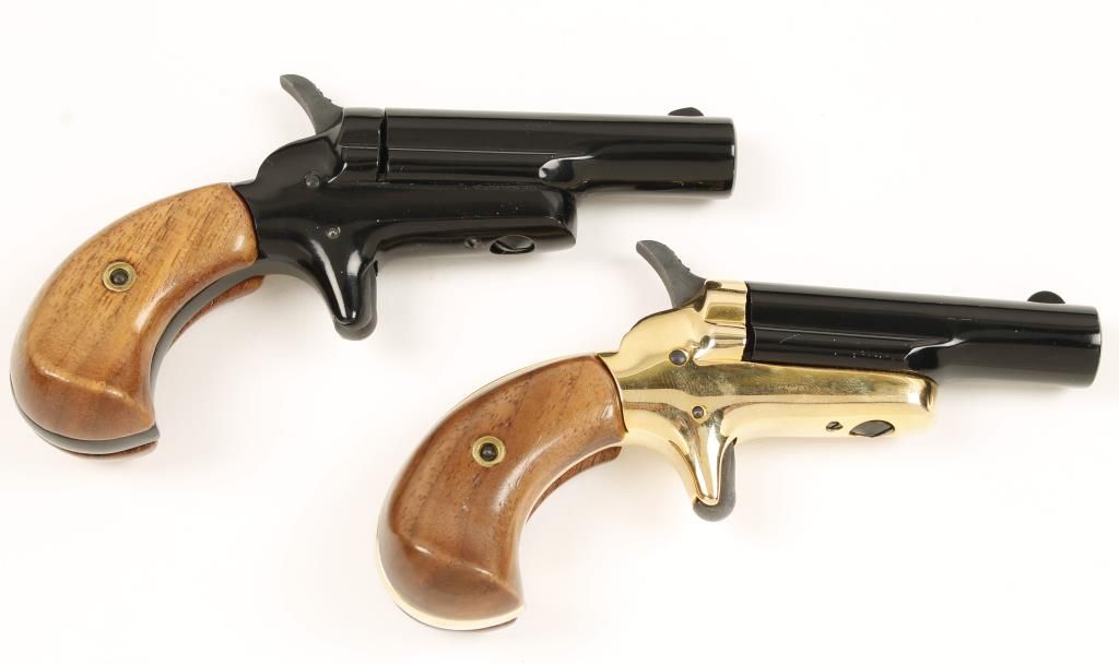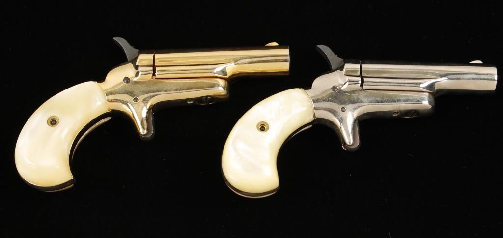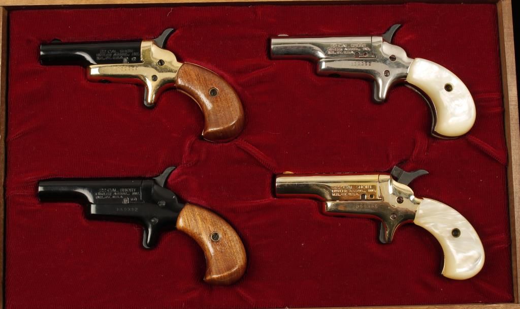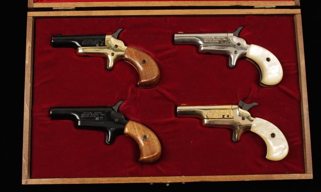 Presentation walnut cased set of four single shot side swing barrel spur-triggered derringers. Copies of the Colt Model 4. One is blued, one is gold-toned, one is silver-toned and the last is two-toned. Consecutive Serial numbers. Receivers and barrels are alloy. Screws, hammers and triggers are blued steel. Grips are Mother-of-Pearl or wood. Interior of case is in red satin and burgundy corduroy. *Curio & Relic*