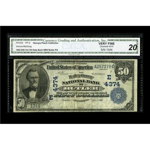 <B>Butler, PA</B></I> - $50 1902 Date Back Fr. 670 <B>The Butler County NB</B></I> Ch. # (E)4374<BR>Less than 90 $50 Date Backs are known on the entire state with the large size count from here at 13. Well margined and bright with signatures that are still visible though quite faded. Graded <B>Very Fine 20</B></I> by CGA.