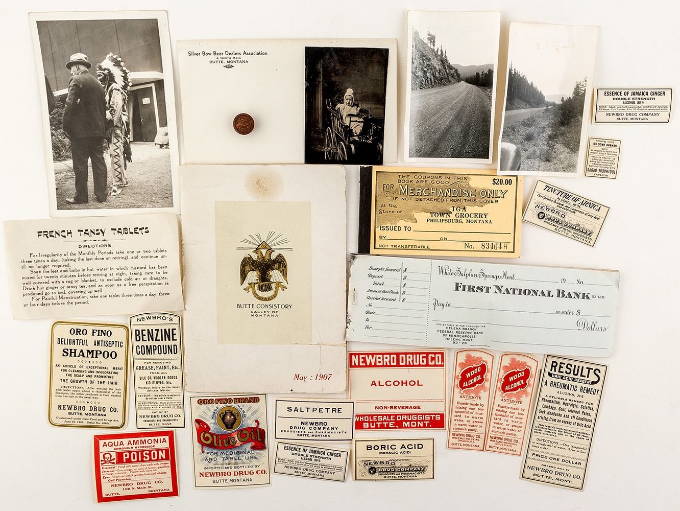 1) Butte Consistory, Valley of Montana, reunion pamphlet, 1907, 2-5) Tintype of baby in buggy and 3 small photos. All came with a large Montana collection. 6) Coupon booklet for IGA Grocery. From $1.00 to 1 cent. Total of $20.00. 7) Unused checks from the First National Bank. These are printed White Sulpher Springs. Folded in middle. 22 total. Rest) Various labels for bottles from the Newbro Drug Company. Best is a full color Oro Fino Brand Olive Oil. Also red poison aqua ammonia, benzine. wood alcohol, Oro Fino shampoo, tincture of arnica, essence of Jamaica Ginger - Double Strength. There are more. 15 total. Date: Location: Butte, Montana HWAC # 44177