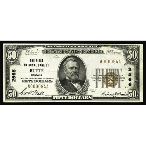 Butte, MT - $50 1929 Ty. 1 The First NB Ch. # 2566High Butte, MT
