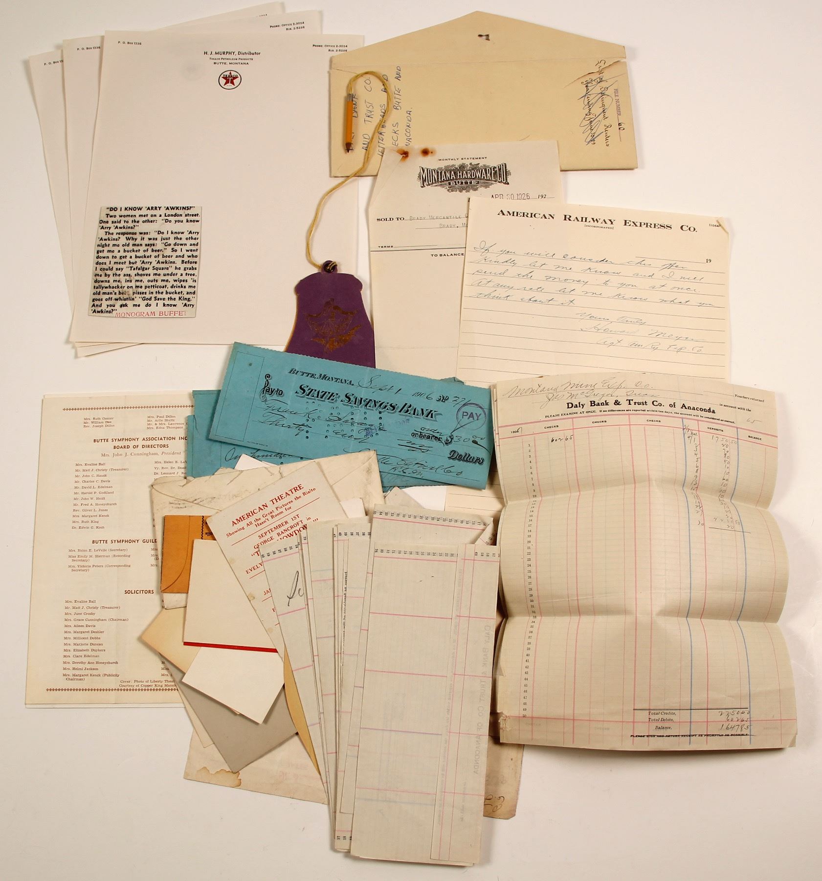 2 checks from State Savings Bank 1906, assorted trade cards, program from 1946 Butte HS Commencement, Texaco letterheads, Montana Mine Exp. Co bank deposit statements c. 1907, Montana Hdwe 1926 billhead and more.