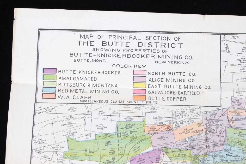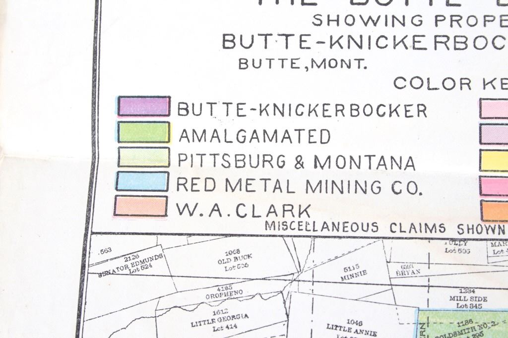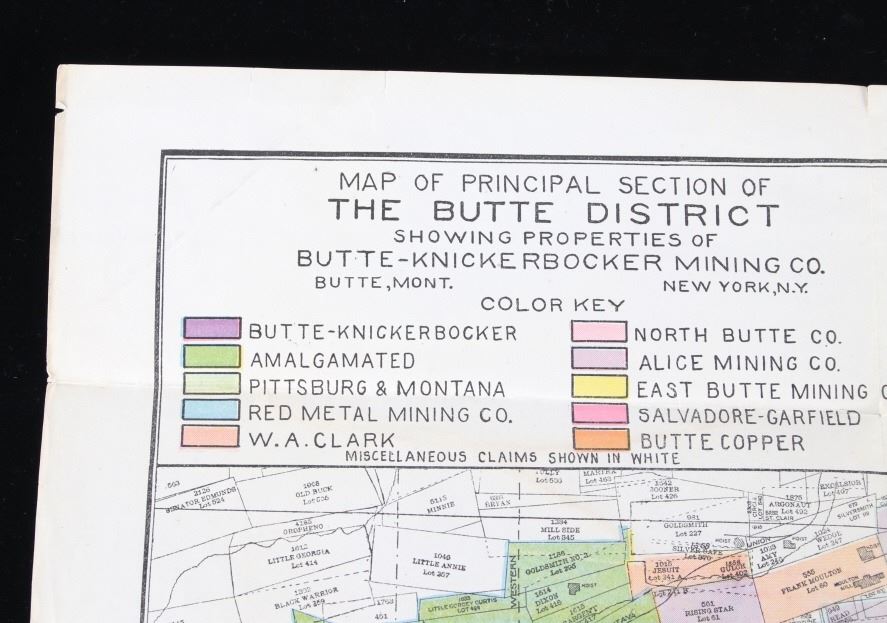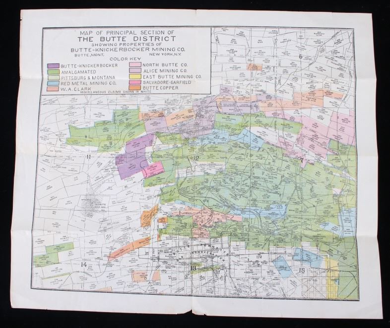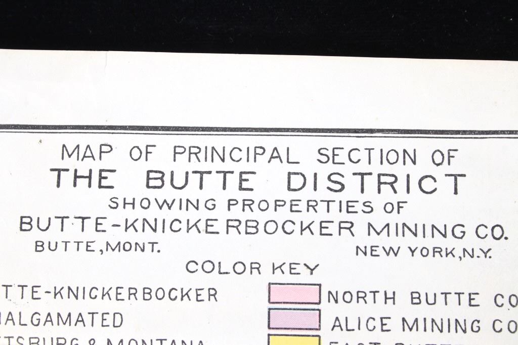 Presented in this lot is a rare colorized map, "Map of Principal Section of The Butte District Showing Properties of Butte-Knickerbocker Mining Co." circa 1896. Historical significance is that this map shows mines of the main players that turned Butte, Montana into the "Richest Hill on Earth": Marcus Daly, W.A. Clark, and F. Augustus Heinze. A mere ten plus years later the Panic of 1907 saw the collapse of the Knickerbocker Trust Company which at the time was one of the largest banks in the USA, and the collapse of the United Copper Company which saw Amalgamated Copper Company extend it's holdings and solidify it's position as king of the copper mining world. The map also shows the rail tracks of the defunct Montana Union Railway and the Butte-Anaconda & Pacific Railway, both being instrumental in the mining history of Butte. This map outlines all the mining claims in and throughout Butte which had hundreds by 1917, and eventually grew to over 11,000 claims!