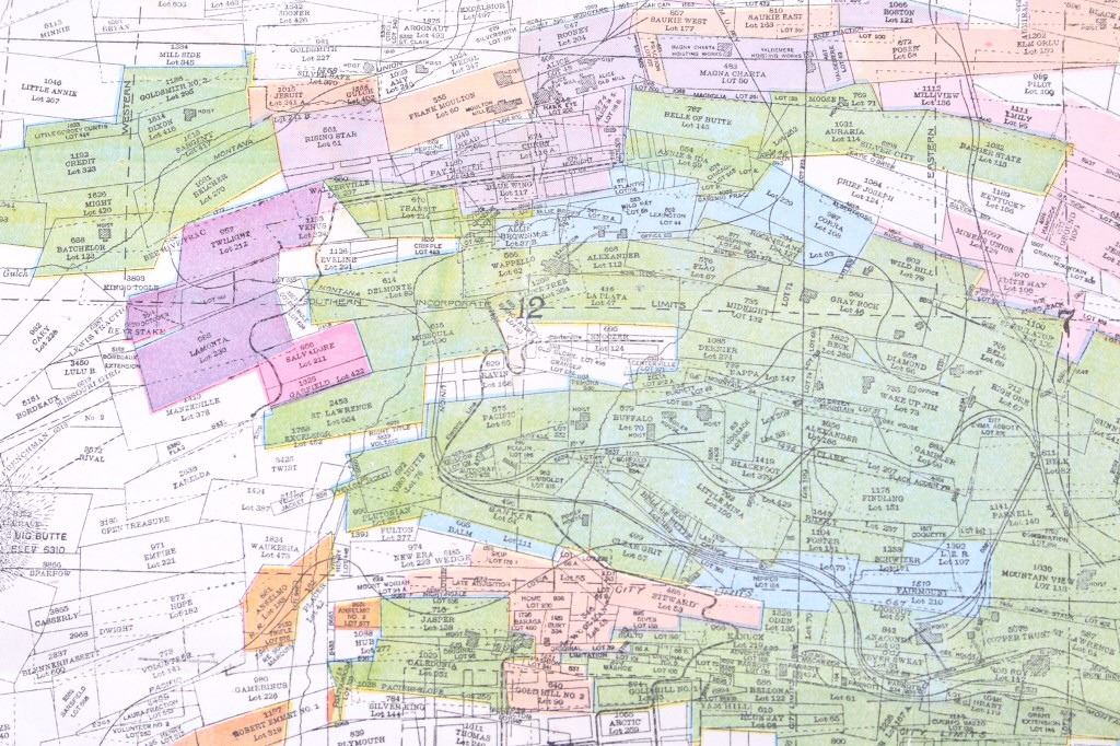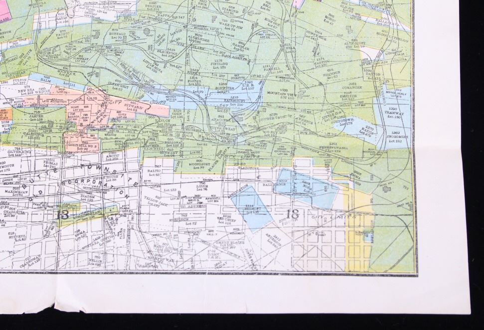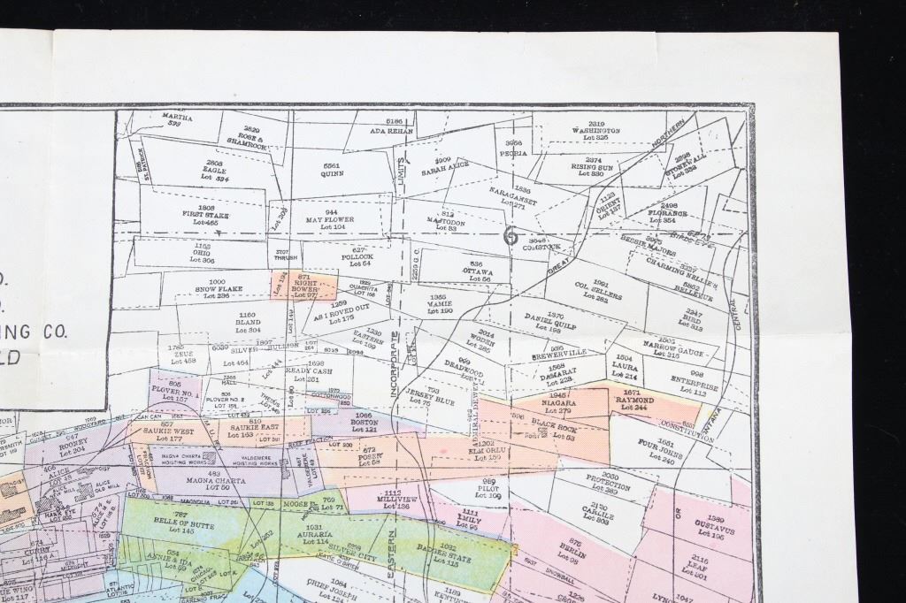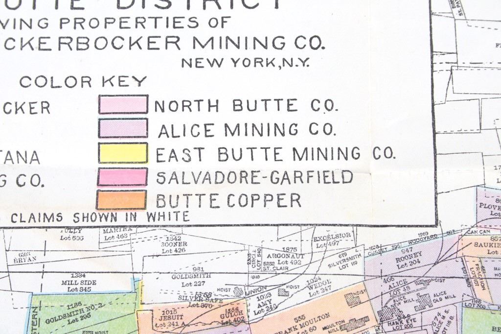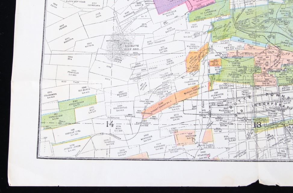 Presented in this lot is a rare colorized map, "Map of Principal Section of The Butte District Showing Properties of Butte-Knickerbocker Mining Co." circa 1896. Historical significance is that this map shows mines of the main players that turned Butte, Montana into the "Richest Hill on Earth": Marcus Daly, W.A. Clark, and F. Augustus Heinze. A mere ten plus years later the Panic of 1907 saw the collapse of the Knickerbocker Trust Company which at the time was one of the largest banks in the USA, and the collapse of the United Copper Company which saw Amalgamated Copper Company extend it's holdings and solidify it's position as king of the copper mining world. The map also shows the rail tracks of the defunct Montana Union Railway and the Butte-Anaconda & Pacific Railway, both being instrumental in the mining history of Butte. This map outlines all the mining claims in and throughout Butte which had hundreds by 1917, and eventually grew to over 11,000 claims!