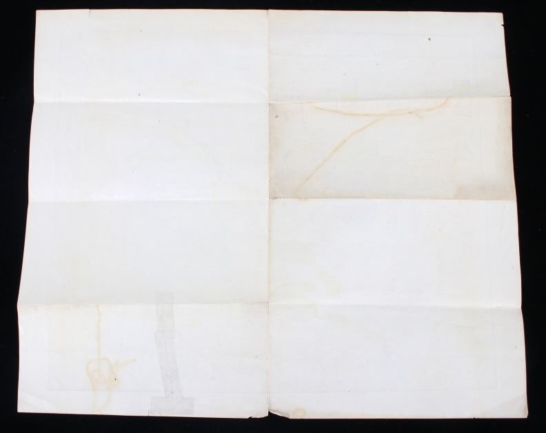 The map is in overall good condition, colours and writing are clear, some taped repair of a lower area tear, slight tears on the edges, foxing noted. Fully open, the map measures 14.75"L x 12.5"W, folded measures 7.5"L x 3.25"W