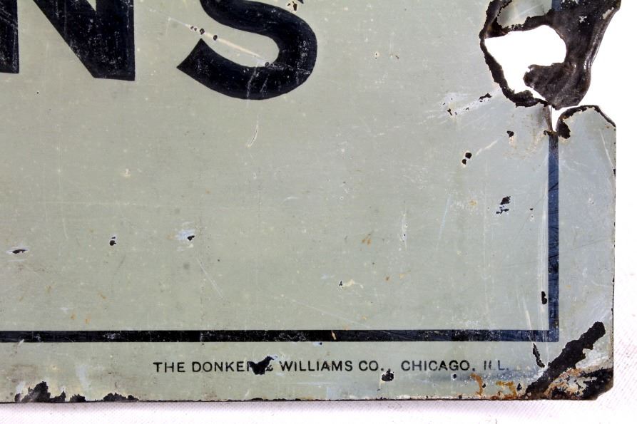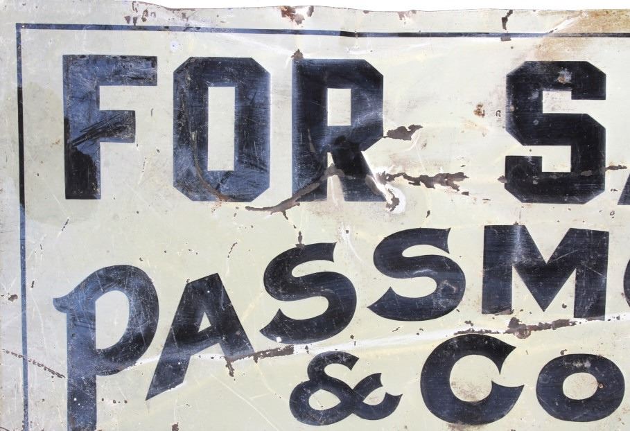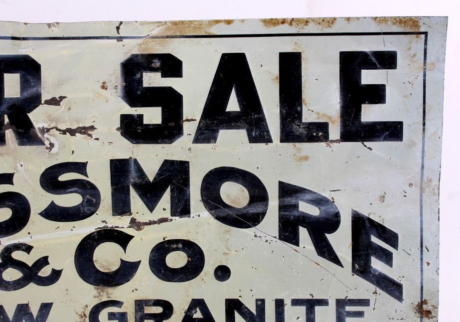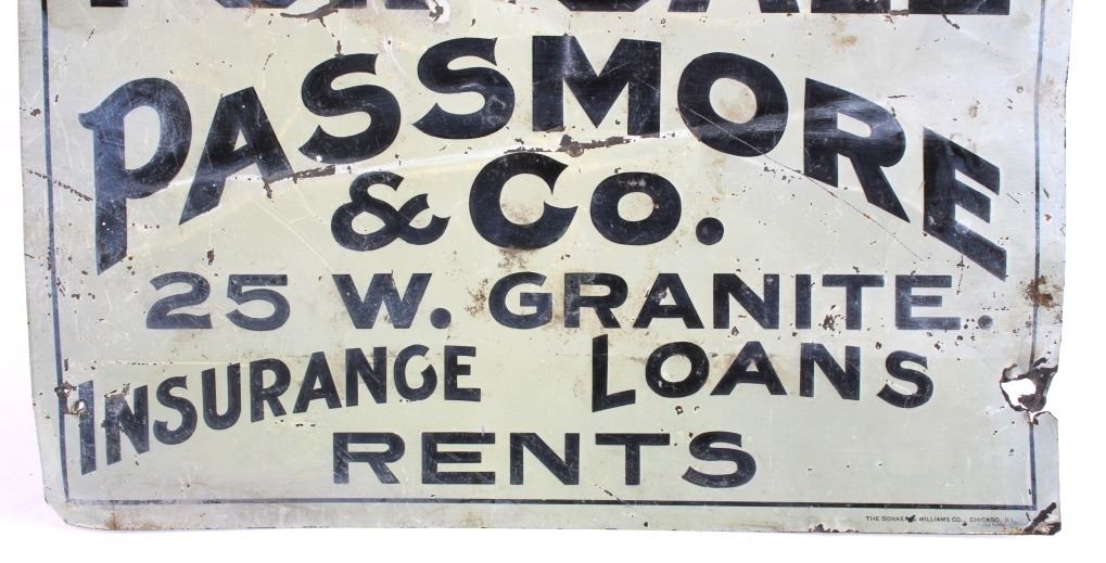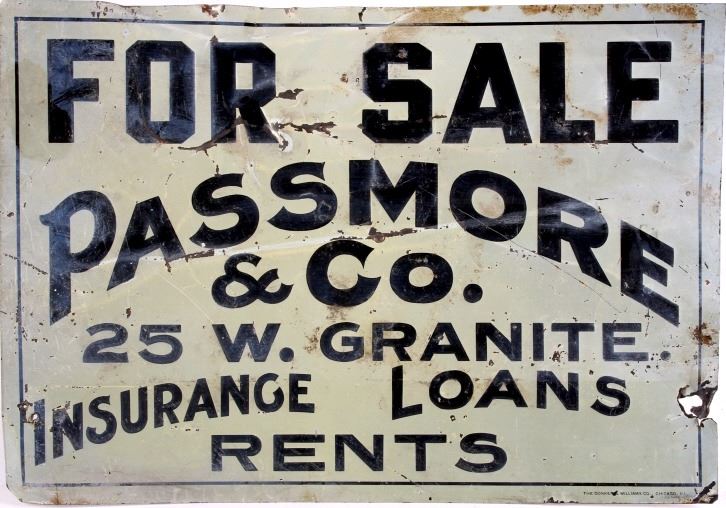 This is an original early 1900's sign from Butt, Montana. The sign reads "For Sale Passmore & Co. 25 W. Granite Insurance Loans, Rents". The sign is embossed tin and shows fair condition with damage and minor rust as shown. The sign measures 9.5" x 14".