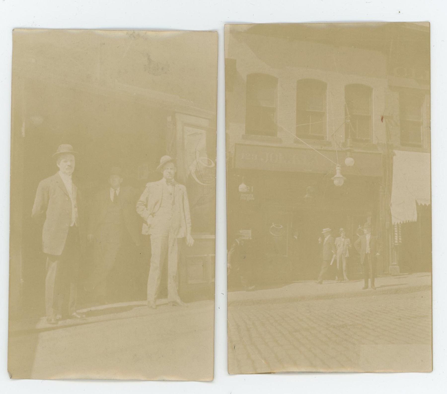 121 Royce's Pool Hall, next to it is 123 Joe K. storefront, with possible store owners out front. 3" by 5". From the Ralph Merry Collection of Historic Photography.