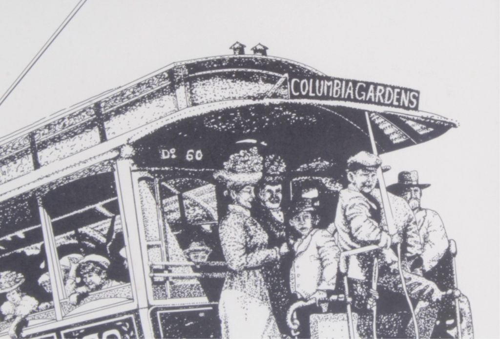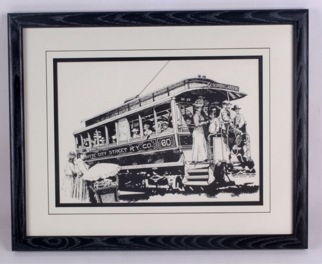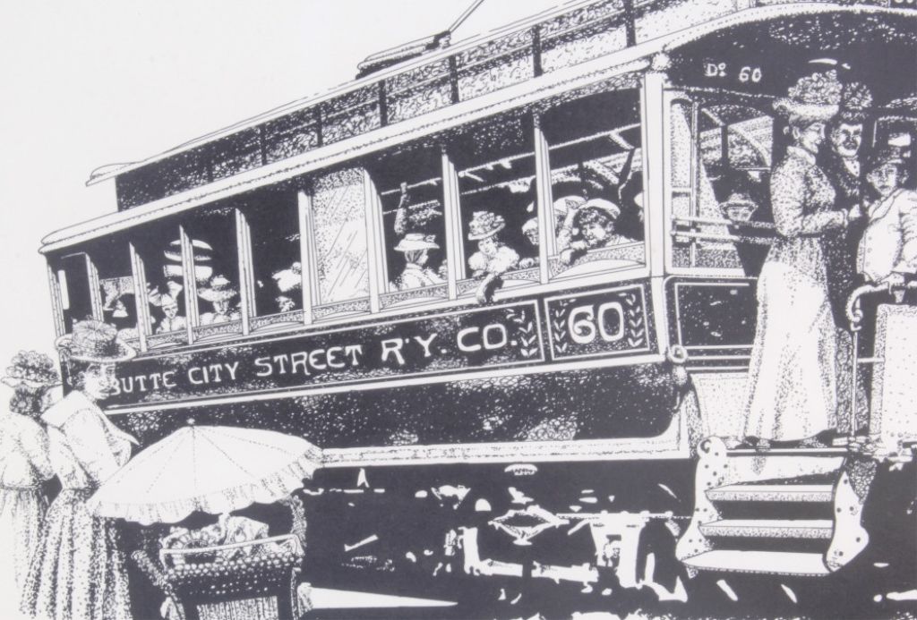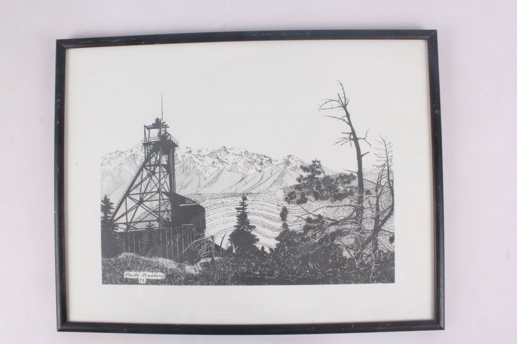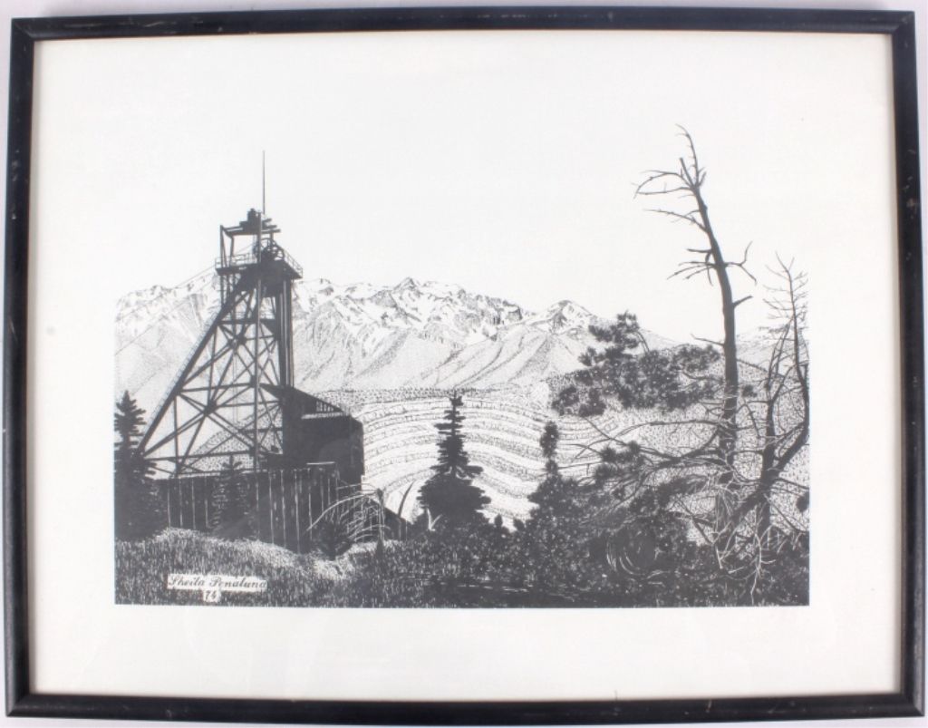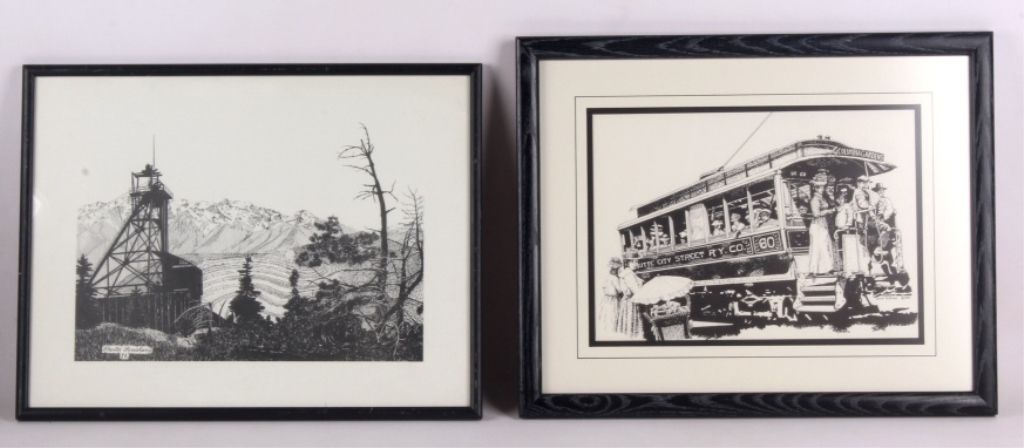 This lot features 2 Butte prints. One depicts the Butte mine headframe and open pit. The other is a scene from the days when passengers would ride the trolley to the Columbia Gardens. The prints measure 15.25" x19.75" and 16.25" x 20.25".