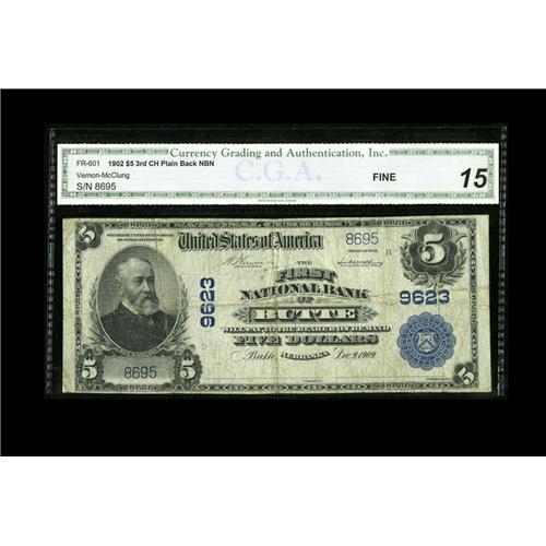 <B>Butte, NE</B></I> - $5 1902 Plain Back Fr. 601 <B>The First NB</B></I> Ch. # 9623<BR><B>CGA Fine 15.</B></I> This was the only bank to issue from this remote Boyd County locale. Of its total emissions of just under $600,000, only $3,990 remained in circulation as of 1935.