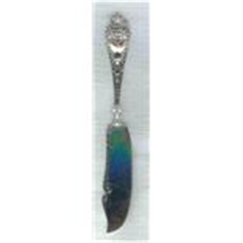 A Beautiful heavy Butter Knife. 6.3/4" long. Maker unknown. The mark is a tiny flag with an "H" in it. There is a cupids face with wings behind it at the top. Very ornate Sterling serving piece.