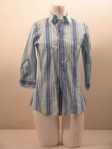 Butter (2011) - Laura (Jennifer Garner) screen worn, hero, light blue with stripes 'Faconnable' shirt, (size 4) and light blue and purple floral print apron. Includes wardrobe tag!