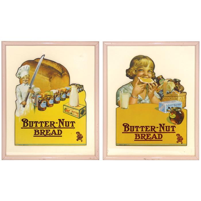 Butter-Nut Bread diecut cdbd signs (2), both w/colorful graphics, framed, Exc cond, 18"H x 15"W.