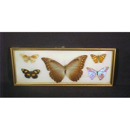 Here is one of those wonderful Brazilian butterfly specimens. It is stunning and amazing ? with colorful butterfly species mounted in a frame under bubble glass. The frame is also very nice ? simple, carved, gold gilded with a black ebony stripe in the middle of the molding. The butterfly specimens are in perfect condition and so is the glass. On the back of the frame it says Made in Brazil. Overall it measures 14 3/8? x 5 ¾? and the sight size is 13 ½? x 4 7/8?.