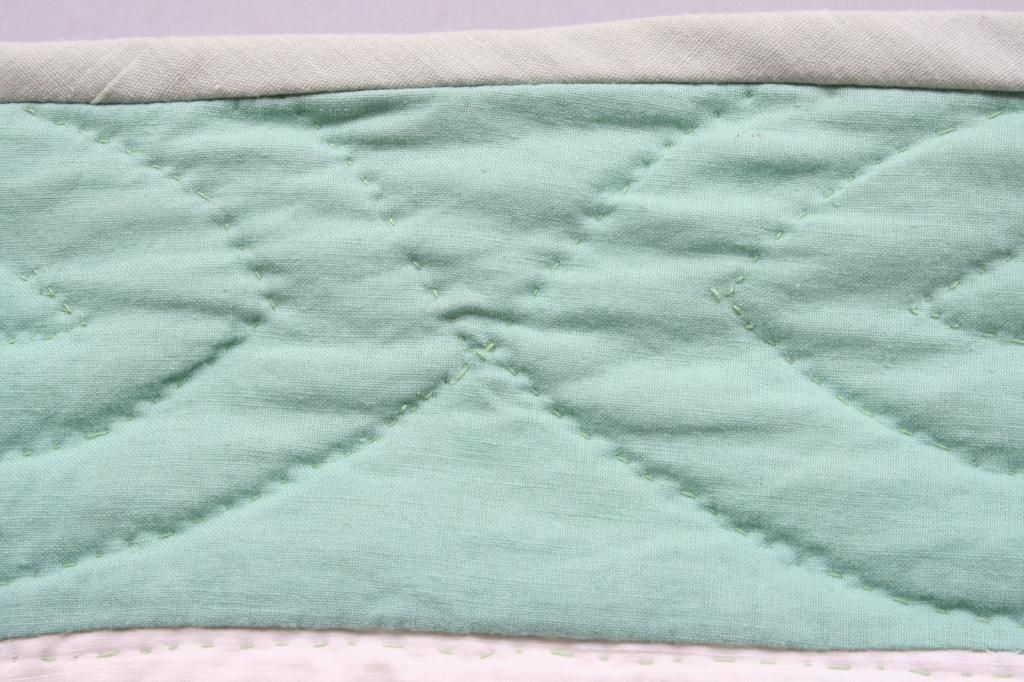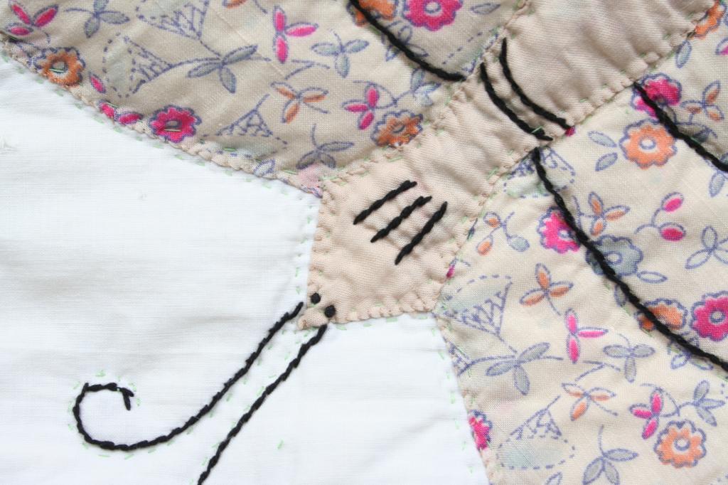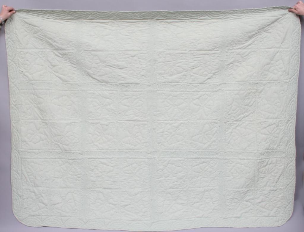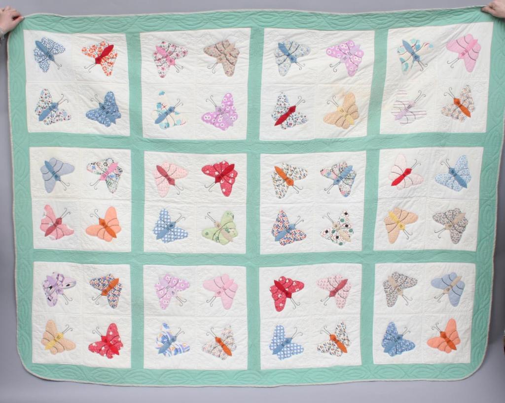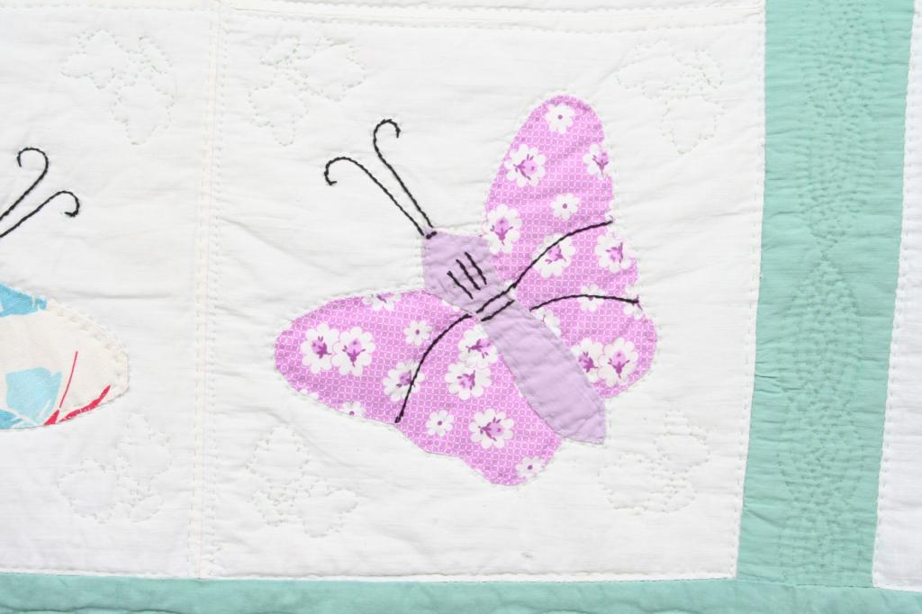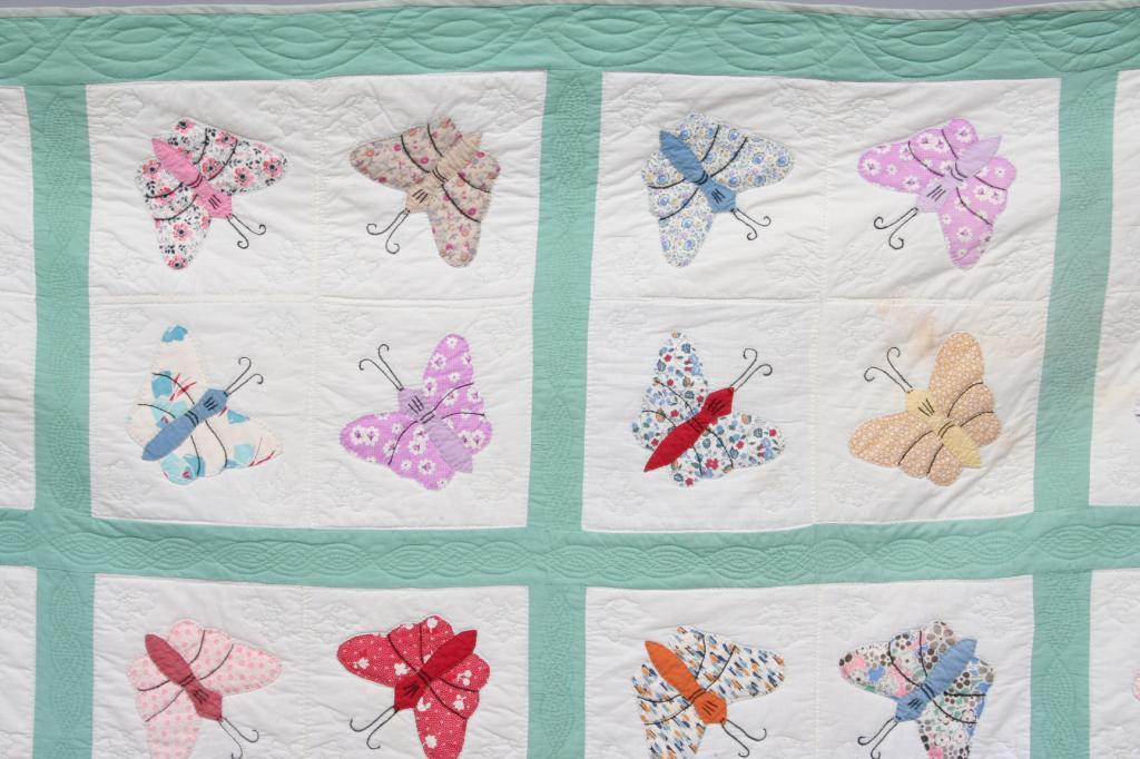 Appliqued with calico butterflies, the details embroidered, enclosed within green panes. 91" x 69 1/2". Condition: good.