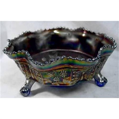 Fenton's large Cobalt Carnival Glass fruit or master berry bowl, three footed with the claw and ball highly detailed motif, in the Butterfly & Berry pattern. Superb iridescence with desired color flashes of green, gold, amethyst color and, of course, electric blue applied on eye pleasing cobalt glass.<BR><BR>Bowl measures 9.6 inches with a sawtooth ruffled rim. Iridized exterior with wide band of alternating butterfly and berry intaglio pattern. Interior of iridized smooth walls with intaglio garland of berry and leaves and a bottom medallion of an intaglio butterfly. Breathtaking in size, color and detail.<BR><BR>Condition is rated near excellent.<BR><BR>