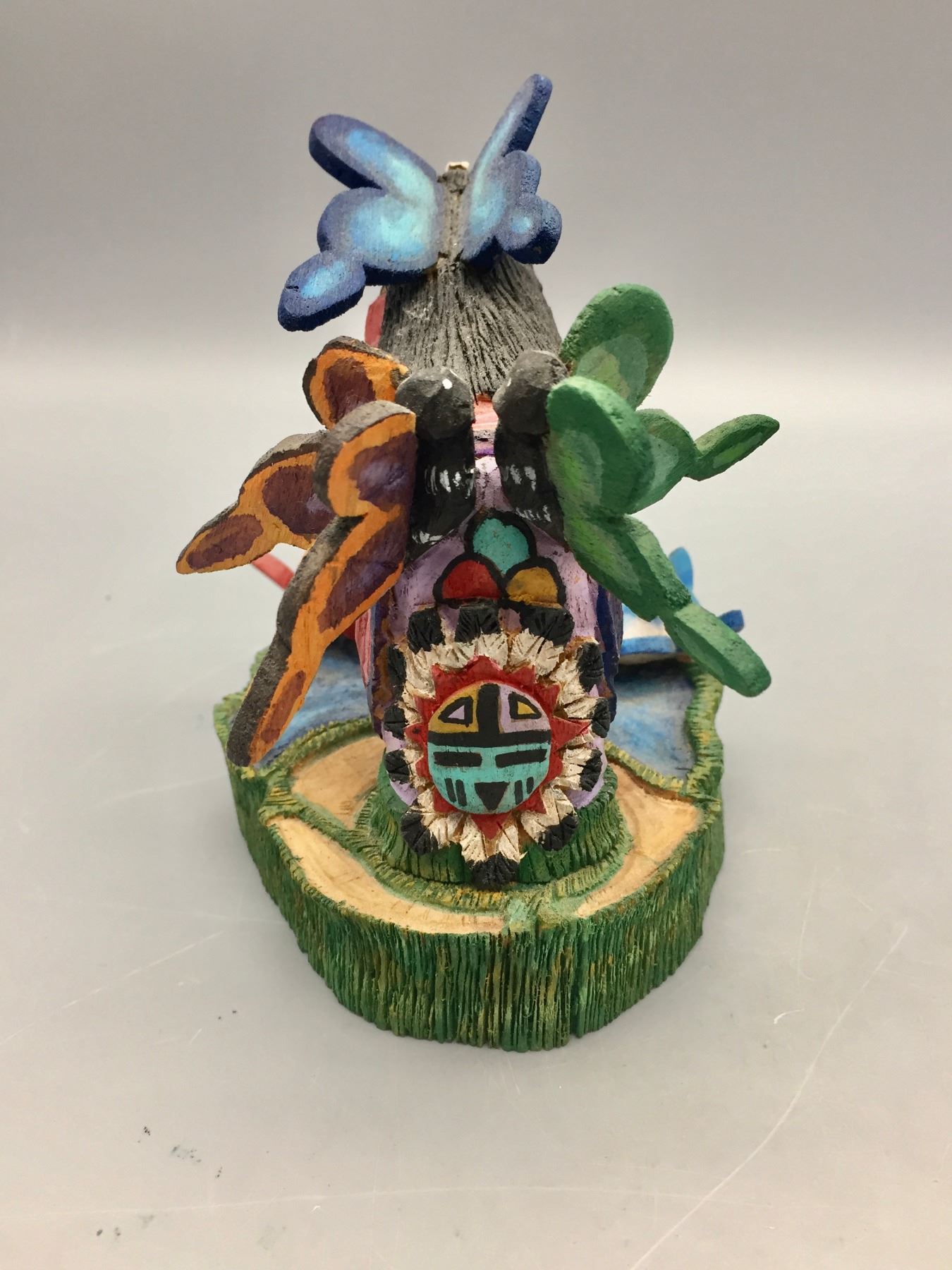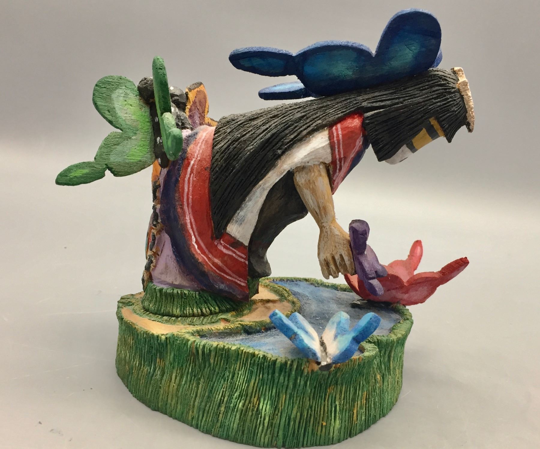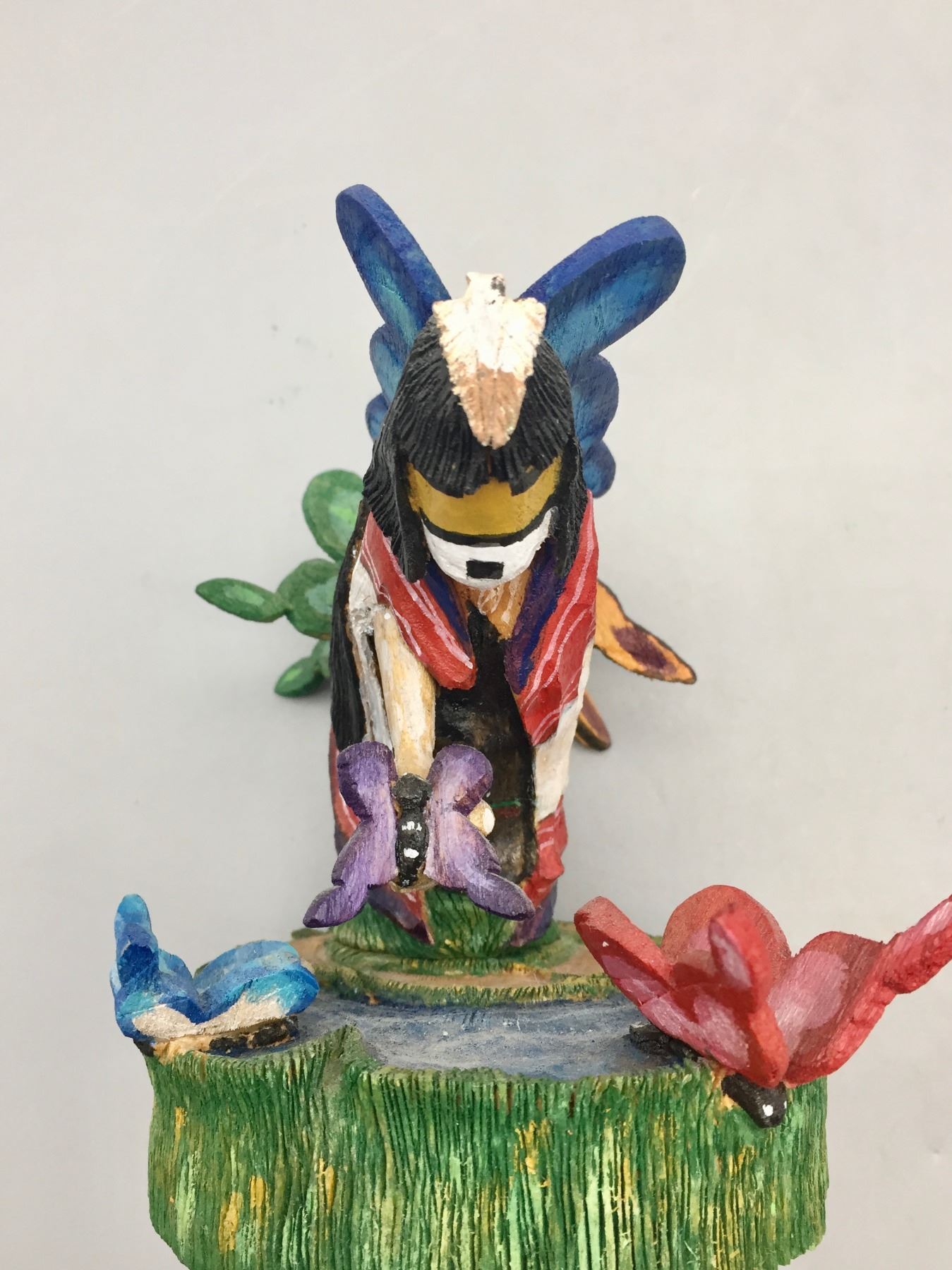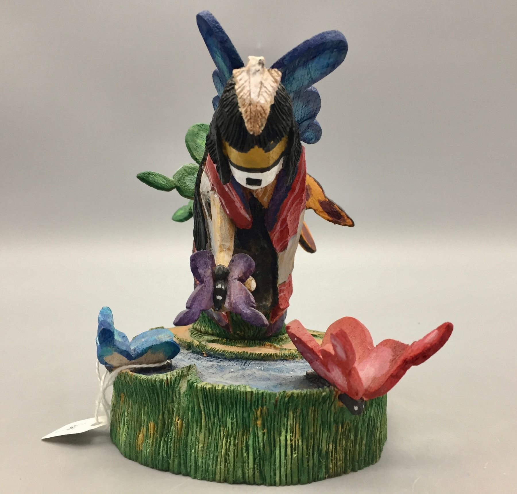 Description: Offered in this lot is a very nice, colorful, Butterfly Maiden Kachina. This Kachina was handcrafted in a highly detailed design. Maker: Signed by an unknown Hopi Artist (hard to read the signature). Approx. Age: Dated 2007. Size: 4”w x 5-1/4” tall. Condition: Good for its age, normal wear expected. Please look closely at the pictures - they are an important part of our description. Shipping: There will be a $10 handling / packaging fee for shipping this lot. The actual cost of postage will be added on top of that.