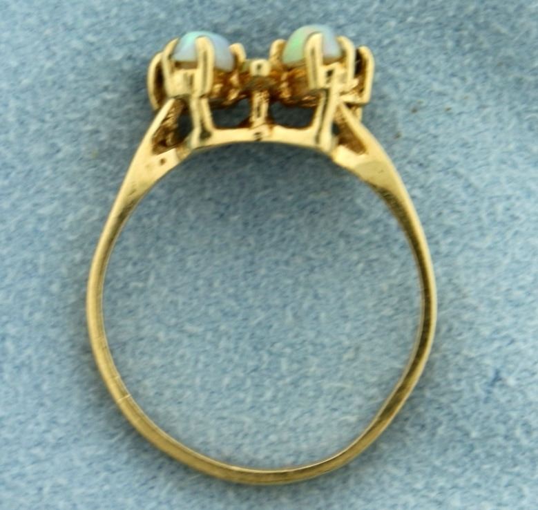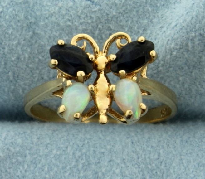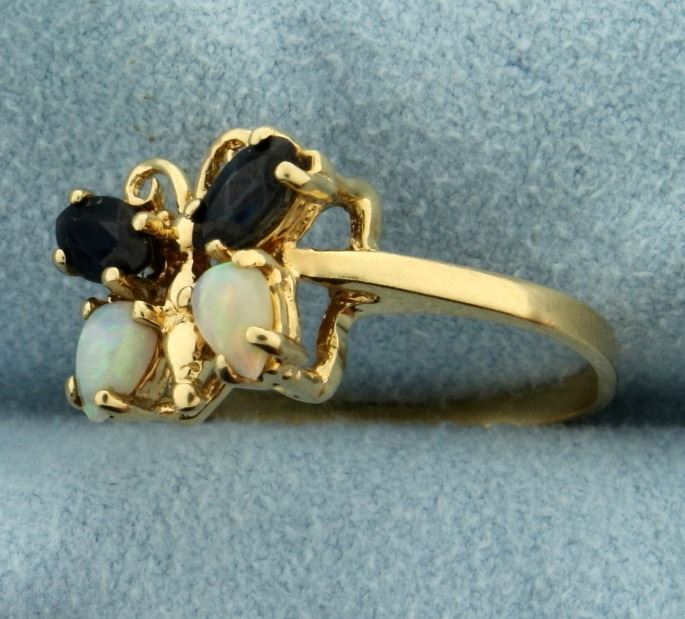 In 14k yellow gold.  Contains two natural marquise shaped 1/3ct sapphires with deep blue color and two pear shaped 1/2ct opals that have an excellent play of color.  Size 5.  2.9g.