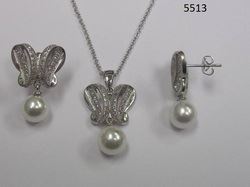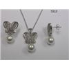 18" Necklace with Pendant and Earring Set Rhodium-Plated Butterfly Shape with round Cubic Zirconia and Lead-Free Glass White Pearl in Gift Box