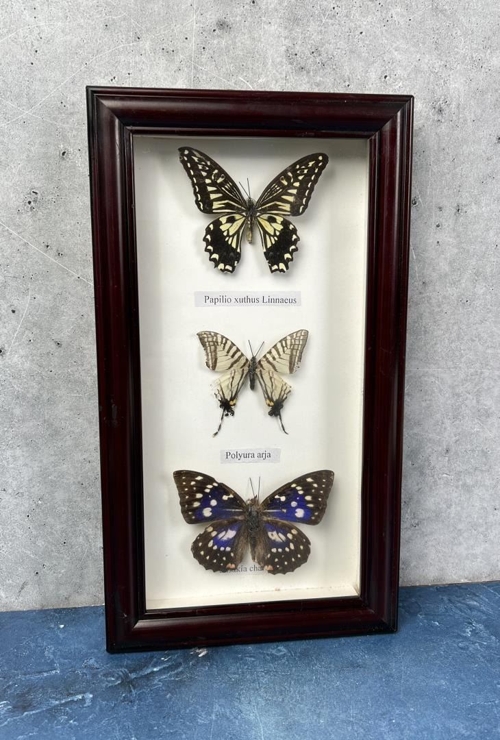 Papilio xuthus Linnaeus, Polyura arja, Sasakia charonda. 13" by 7" framed.