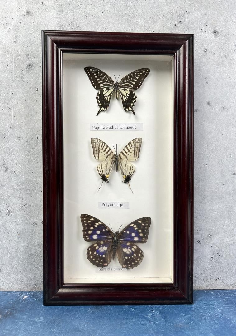 Papilio xuthus Linnaeus, Polyura arja, Sasakia charonda. 13" by 7" framed.