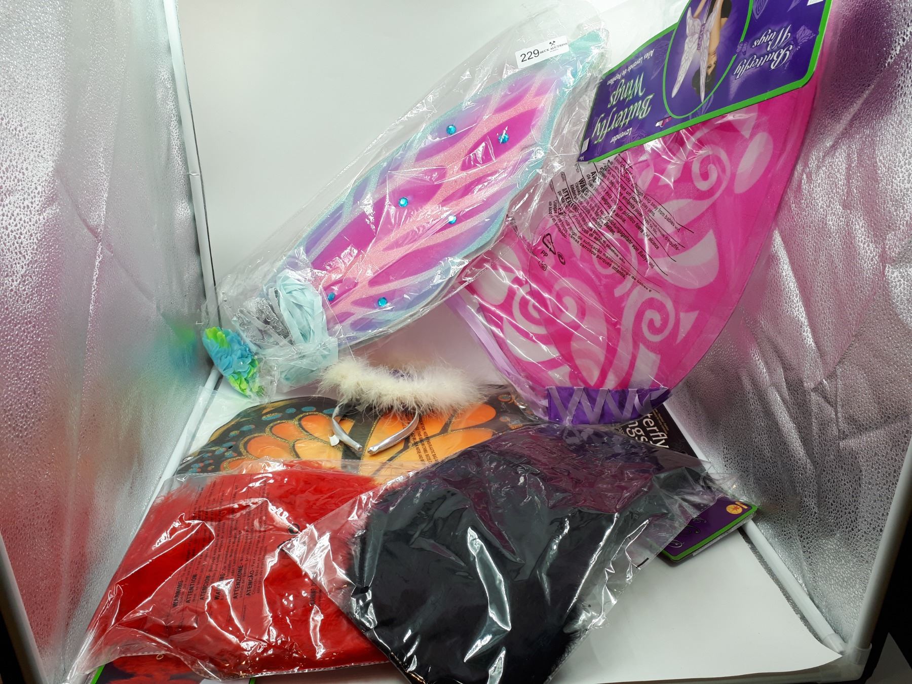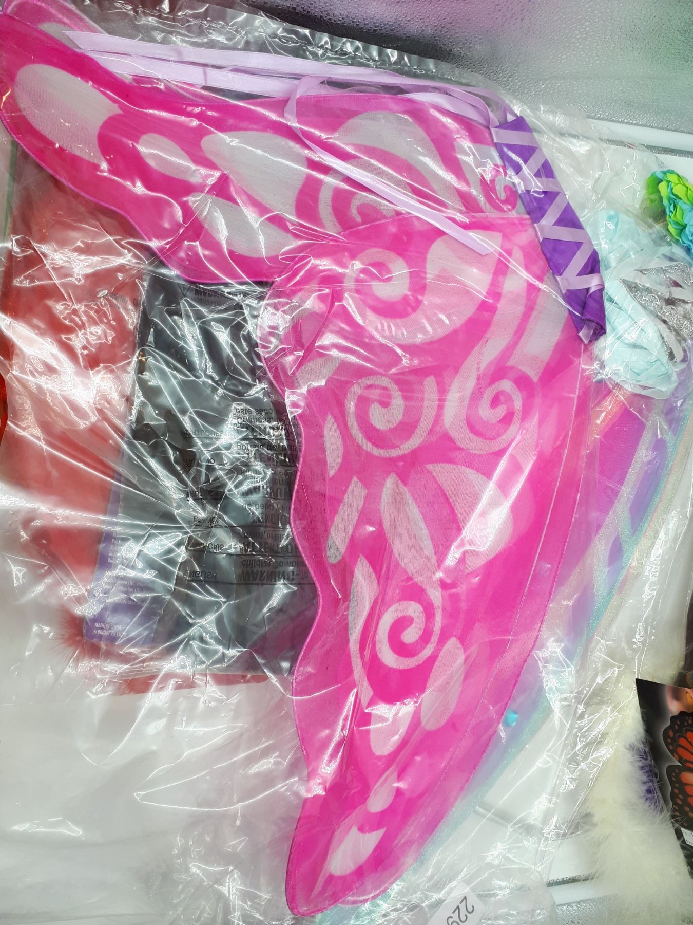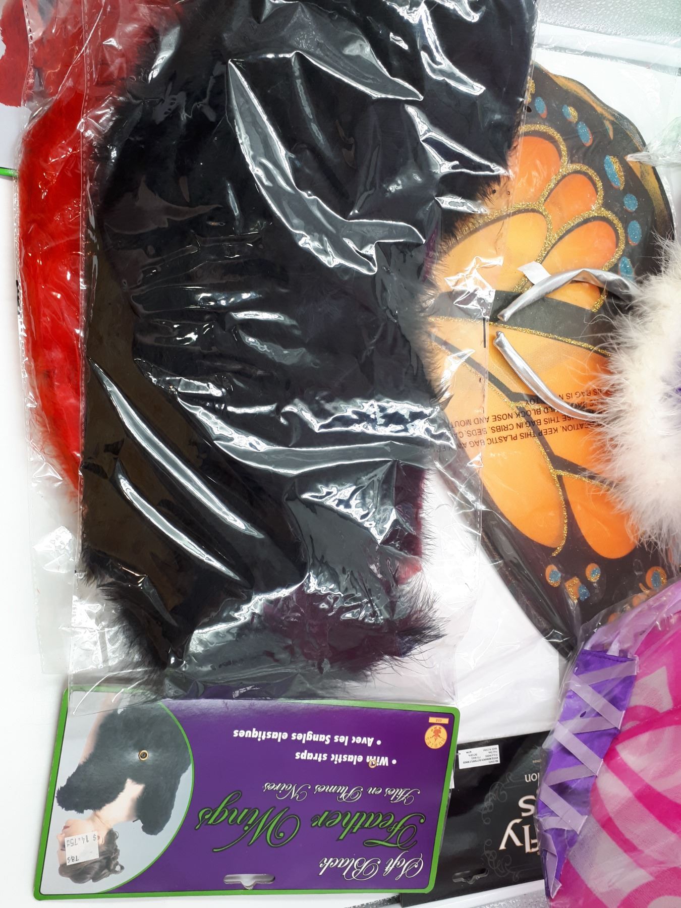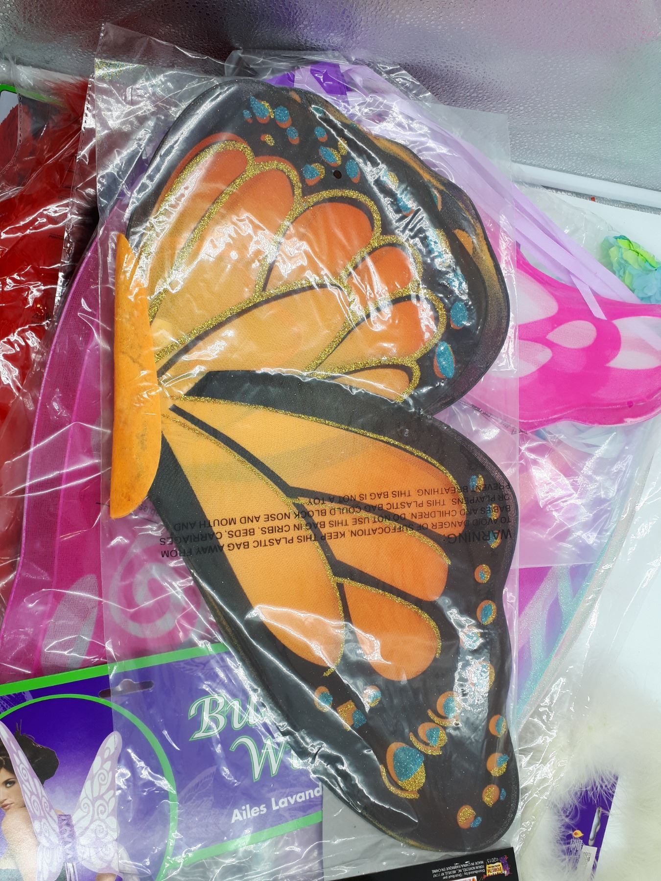 Lot of 3 pcs butterfly wings, 2 pcs feather wings (red and black) and 2 x halo headband. Not intended for girls under 14 years old.