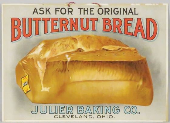 Butternut Bread Cardboard String Hanging Sign. Slight paper loss at perimeter top edge otherwise excellent condition. 14 X 10 inches.
