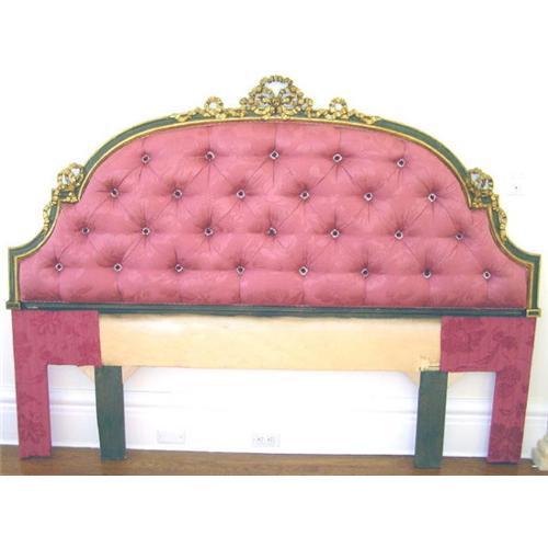 This antique reproduction, king sized headboard in French classical style is approximately 14 years old and in excellent condition. It features burgundy colored, button-back upholstery and carved ribbon motif along the crestrail. No stains or discoloration to the fabric. Measures 80" wide, 55" high and roughly 6" deep. Bottom of upholstered section is 24" from the floor. No footboard is available. Available for shipment or pickup in Greenwich CT.