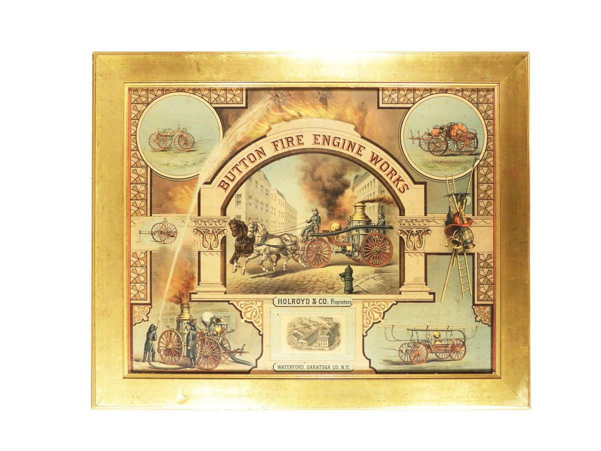 Button Fire Engine Works Lithograph Advertising Sign, paper. Holroyd & Co. Proprietors. Waterford, Saratoga Co. NY. Depicts steamer in center with vignettes of various equipment for the Button Co. Small nail holes on bottom left otherwise very good original condition. 23 X 18 inches.