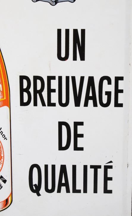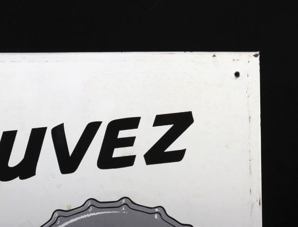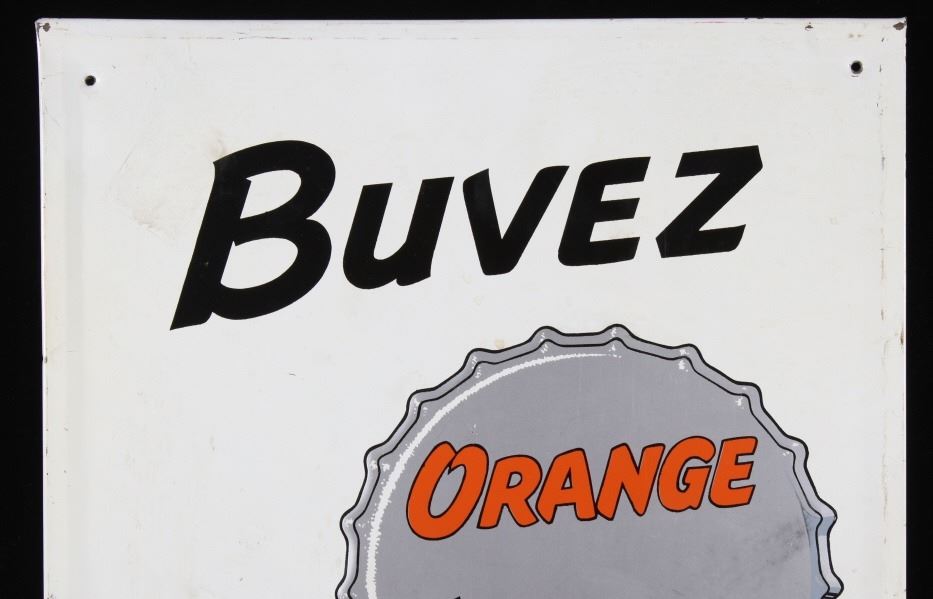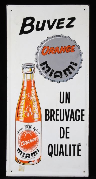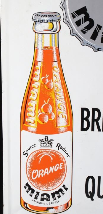 Included in this lot we have a Buvez orange soda metal advertising sign. The sign shows a white field with the image of a orange soda glass bottle and a bottle cap. The sign is marked across the front reading "Buvez Orange Miami Un Breuvage De Qualite" in black lettering. The bottle is marked "Orange Miami Source Radnor Orange Miami Marque Deposee". The sign shows good condition overall. The piece measures 14" wide by 29 1/4" tall.