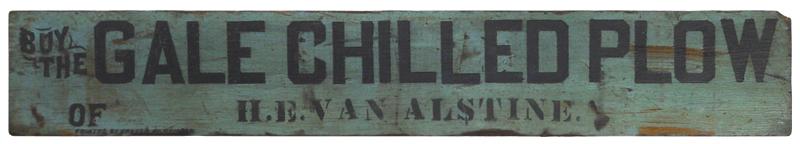 Buy Gale Chilled Plow sign-Sold by H.E. Van Alstine, printed by Cross Co.-Chicago, primitive wooden sign, c.1890, VG/Exc cond, 6"H x 36"W.