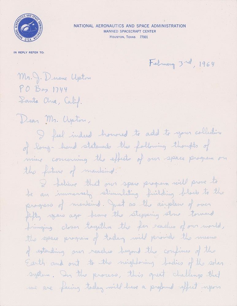 Wonderful ALS signed “Edwin E. Aldrin, Jr., Major USAF, NASA Astronaut,” two pages, 8 x 10.5, NASA letterhead, February 3, 1964. Letter to J. Duane Upton, in full: "I feel honored to add to your collection of long-hand statements the following thoughts of mine concerning the effects of our space program on the future of mankind. I believe that our space program will prove to be an immensely stimulating building block to the progress of mankind. Just as the airplane of over fifty years ago became the stepping stone toward bringing closer together the far reaches of our world, the space program of today will provide the means of extending our reaches beyond the confines of the Earth and out to the neighboring bodies of the solar system. In the process, this great challenge that we are facing today will have a profound effect upon all of mankind. Our space program will stimulate the inventiveness of our scientists and engineers, the creativity of our scholars, the emotions of our artisans, the economy of our industry and nation, the imagination of our youth and the wisdom of our leaders. Our country and the free world cannot fail to accept this great opportunity." Included is a glossy 4 x 5 black and white formal portrait of Aldrin wearing a suit and tie, signed and inscribed in blue fountain pen, "To J. Duane Upton, with Best Wishes, Edwin E. Aldrin, Jr.," with the reverse stamped: "Edwin E. Aldrin, Jr., Major USAF, NASA Astronaut." In fine condition, with significant signature contrast to the photo. Accompanied by the original mailing envelope addressed by Aldrin, who incorporates his name into the return address field, "Major E. E. Aldrin, Jr."
