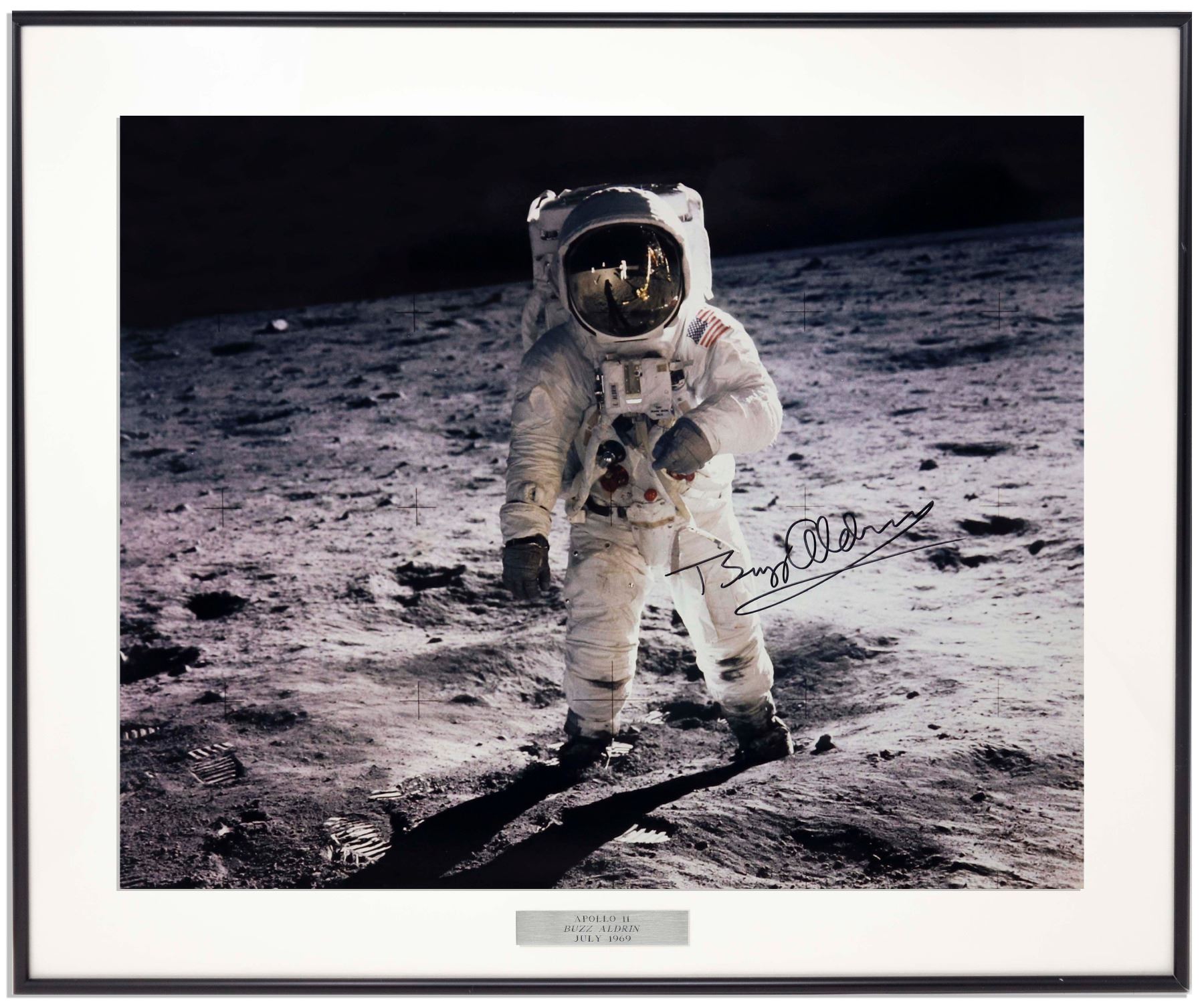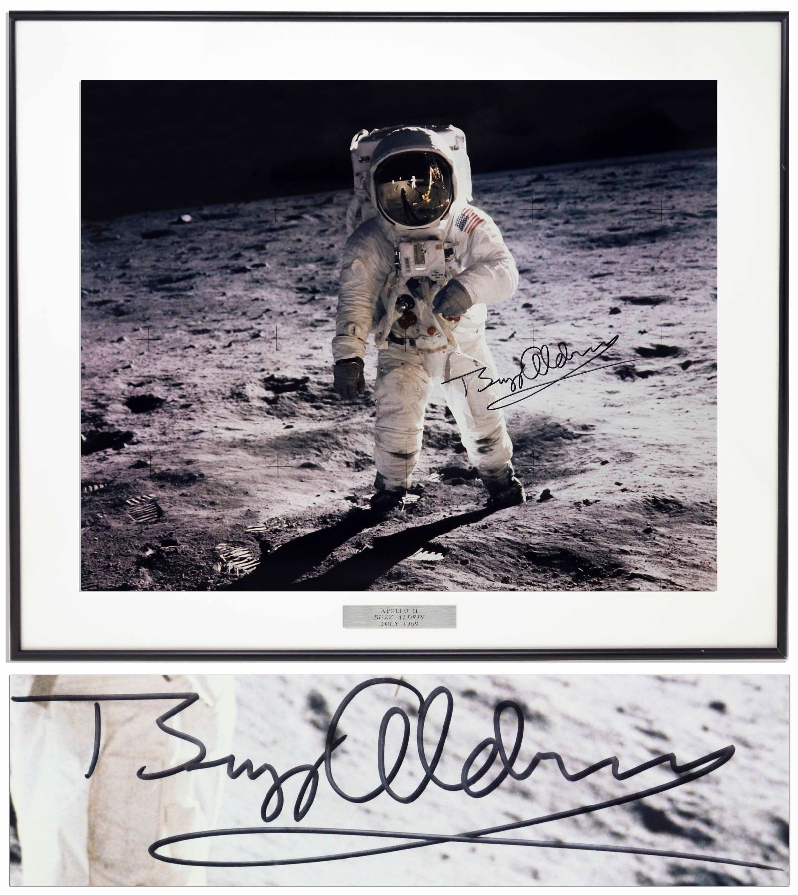 Buzz Aldrin signed 20'' x 16'' photo, dramatically showing Aldrin on the lunar surface, as taken by Neil Armstrong who appears in Aldrin's visor. Aldrin signs in black felt-tip, underlining his name. Framed to 24.25'' x 20.25'' with a plaque at bottom reading ''Apollo 11 / Buzz Aldrin / July 1969''. Near fine condition.