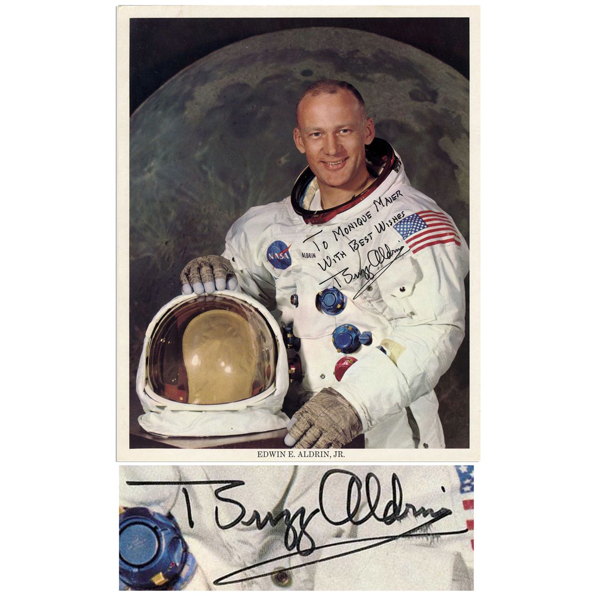 Buzz Aldrin photo bearing his signed autograph inscription in black ink, ''To Monique Maier With Best Wishes / Buzz Aldrin''. Glossy 8'' x 10'' photo has a slight smudge to ''Aldrin'', else near fine.