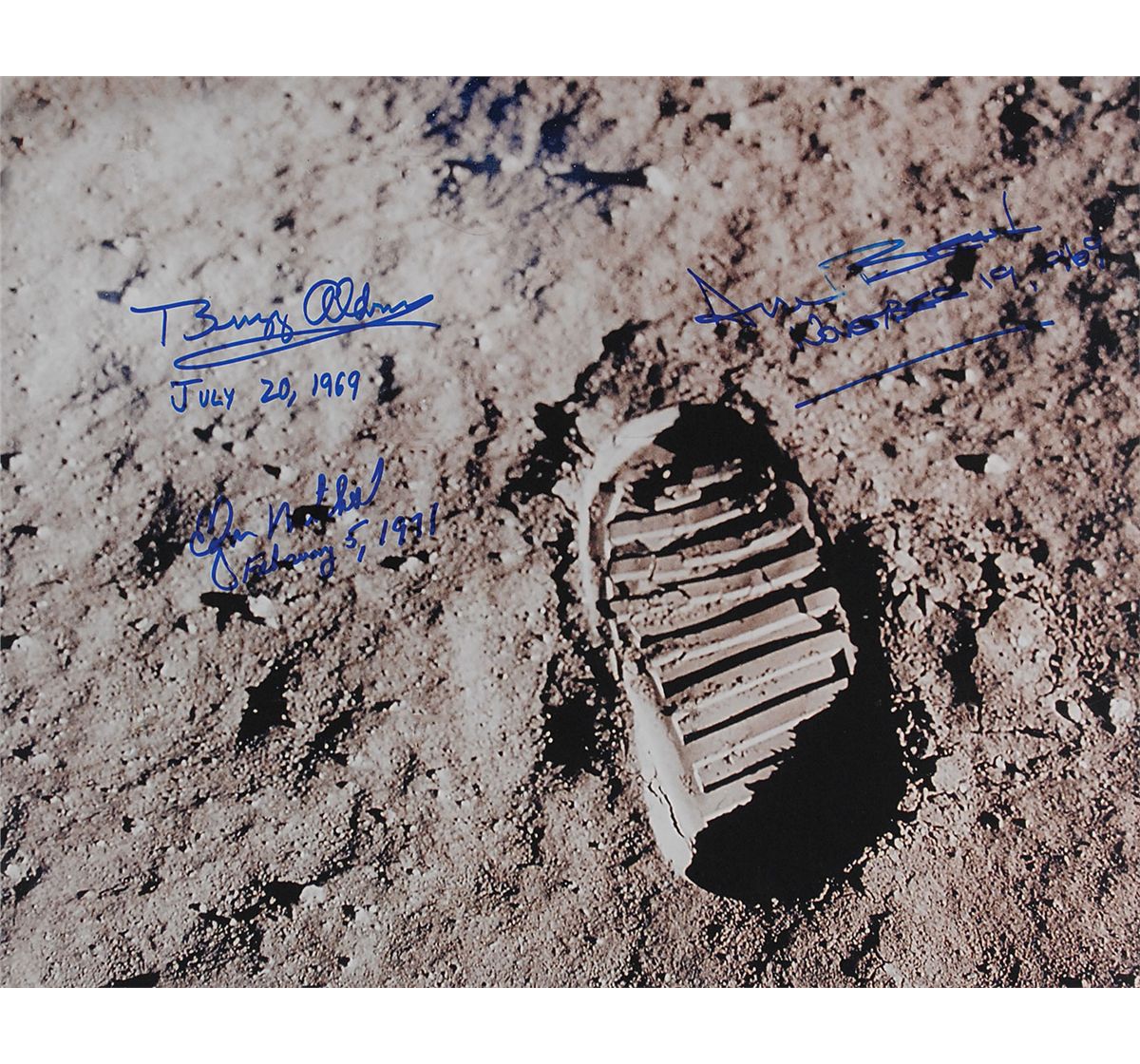 Color satin-finish 19.5 x 16 photo of a footprint on the lunar surface, signed in blue felt tip, “Buzz Aldrin, July 20, 1969,” “Alan Bean, November 19, 1969,” and “Edgar Mitchell, February 5, 1971.” Rolled and in fine condition.