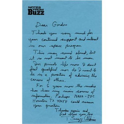<B>Buzz Aldrin Autograph Letter Signed</B></I> “<I>Buzz Aldrin,</B></I>”one page, 5.5” x 8.5”. No place, c. 1977. On his “<I>Notes from Buzz</B></I>” stationery, the Apollo 11 Lunar Module Pilot writes to “<I>Gordon.</B></I>” In full, “<I>Thank you very much for your continued support and interest in our space program. This may sound abrupt, but it is not meant to be mean. In private life now I don't feel qualified nor do I want to be in a position of advising the careers of others. For 6 years now the media has been my main source of information. Perhaps NASA-JSC Houston TX 72058 could answer your question. Thanks again and God bless you too.</B></I>” Aldrin resigned from NASA in July 1971. Handwritten letters of Aldrin are rare.<BR><BR><b>Shipping:</b> Flat Material, Small (<a target="_blank" href="http://www.heritageauctions.com/common/shipping.php">view shipping information</a>)