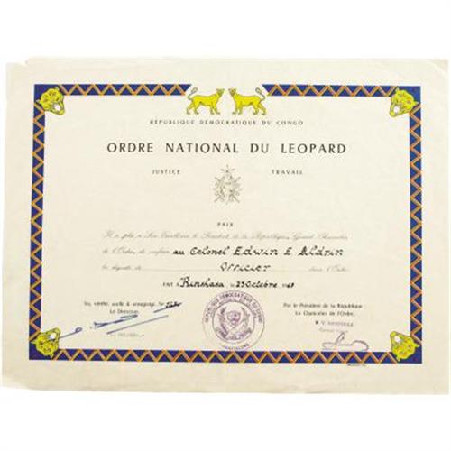 <B>Colonel Buzz Aldrin Award Certificate for the Ordre National du Leopard, Democratic Republic of Congo.</B></I> Aldrin was made an officer in the order following the flight of Apollo 11. The document, on parchment-like paper, is 15.5" x 11.5". Issued in Kinshasa on October 23, 1969. There is a central vertical fold and a small tear in the upper left corner. Fine. <I>From the personal collection of Dr. Buzz Aldrin and accompanied by a signed Letter of Authenticity from him.</B></I><BR><BR><b>Shipping:</b> Flat Material, Small (<a target="_blank" href="http://www.heritageauctions.com/common/shipping.php">view shipping information</a>)