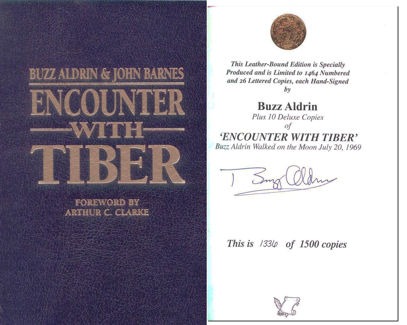 Buzz Aldrin signed copy of ''Encounter With Tiber,'' by Buzz Aldrin and John Barnes. Aldrin's novel chronicles two former enemies who, once battling each other for control of the frontier blazed by the Apollo astronauts, now must work together when a radio beacon from deep space is discovered. Nashville: The FlatSigned Press: 2005. Signed ''Buzz Aldrin'' in blue ink on special limitation page. Numbered 1,336 of 1,500 copies printed. Hardcover leather bound book with bright yellow silk moire endpapers measures 6.25'' x 9.25''. Fine.
